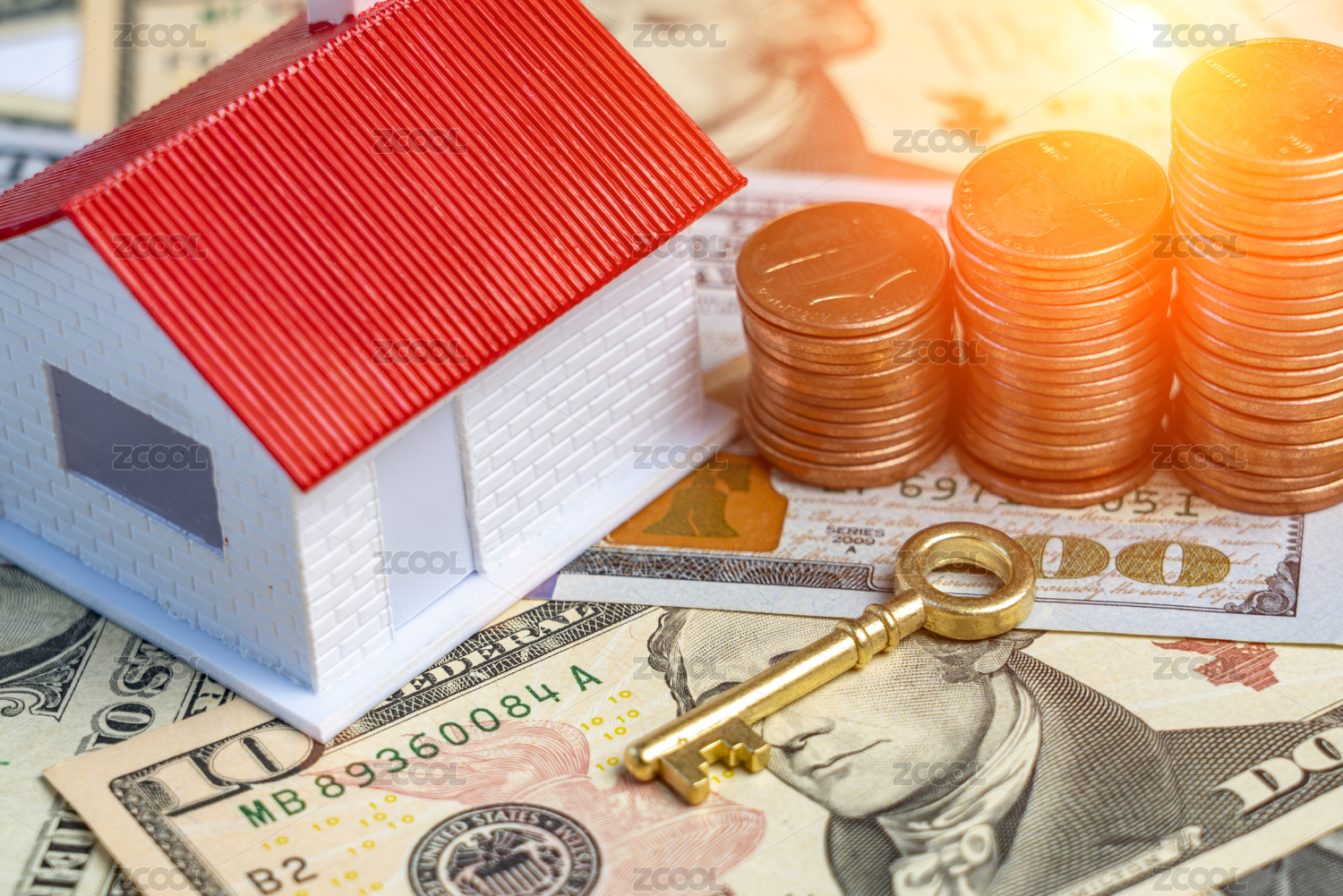 玻璃瓶里盛放的美元硬币长出嫩芽及旁边的一排硬币和一个小房子模型