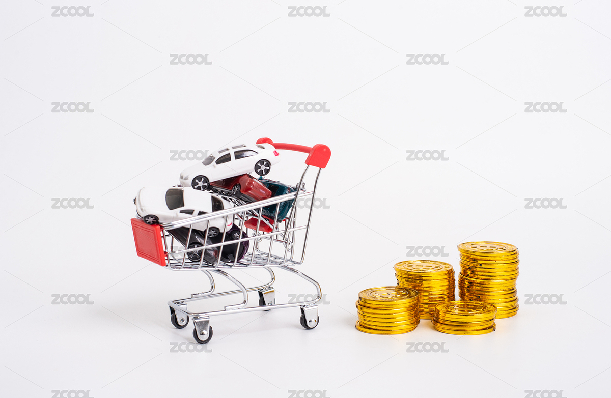 白背景上一排递减的欧元硬币和后面购物车模型及里面一辆小汽车模型