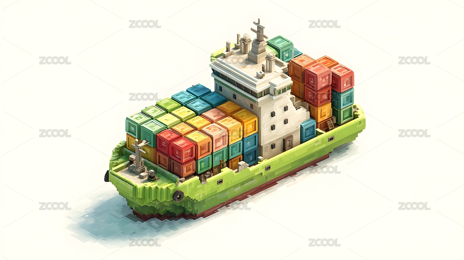 卡通货船装载集装箱 绿色海运运输