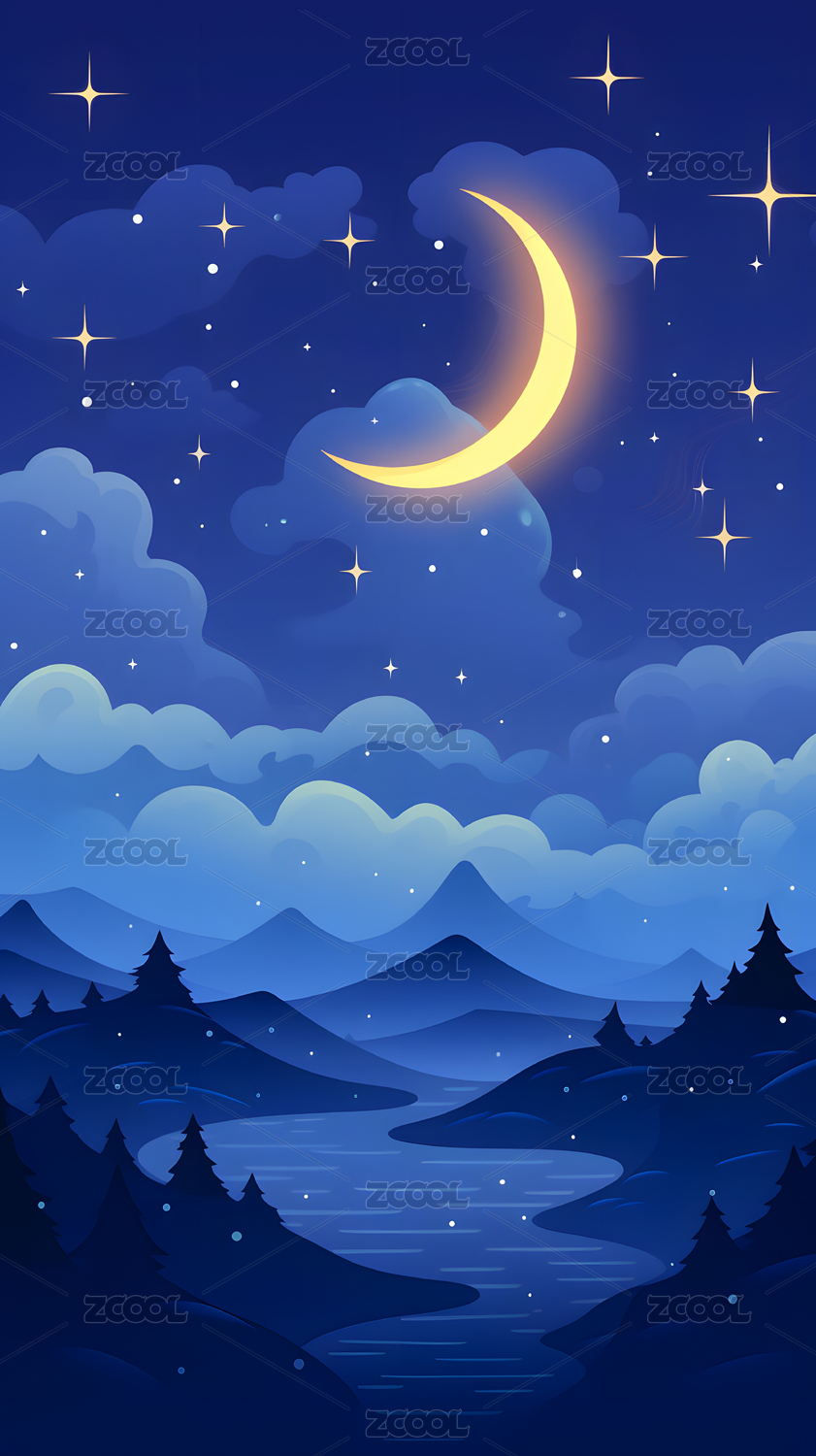 数码平静夜晚星星月亮抽象图形海报背景