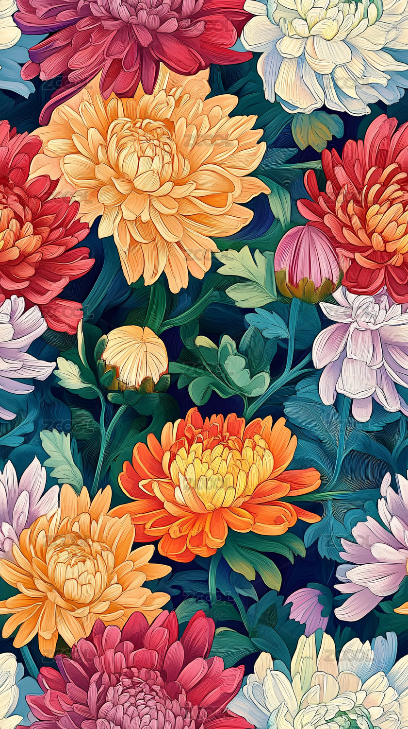 四方连续绚丽多彩的菊花印花背景