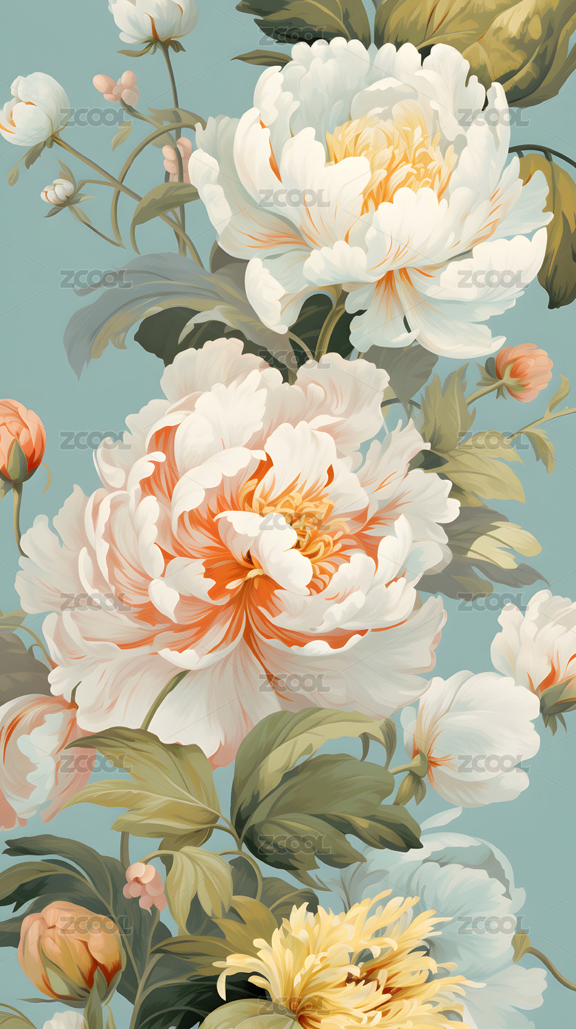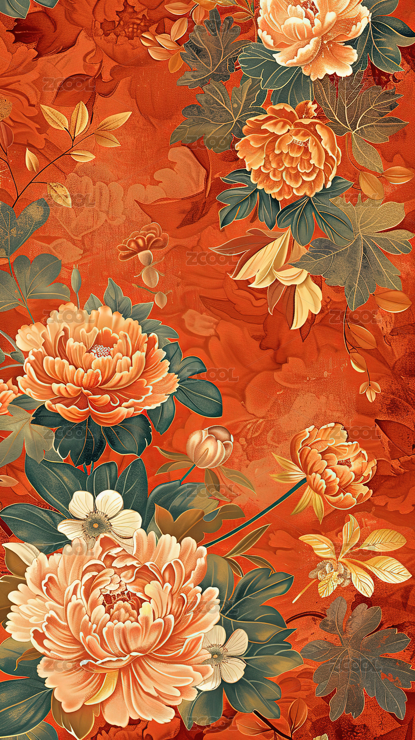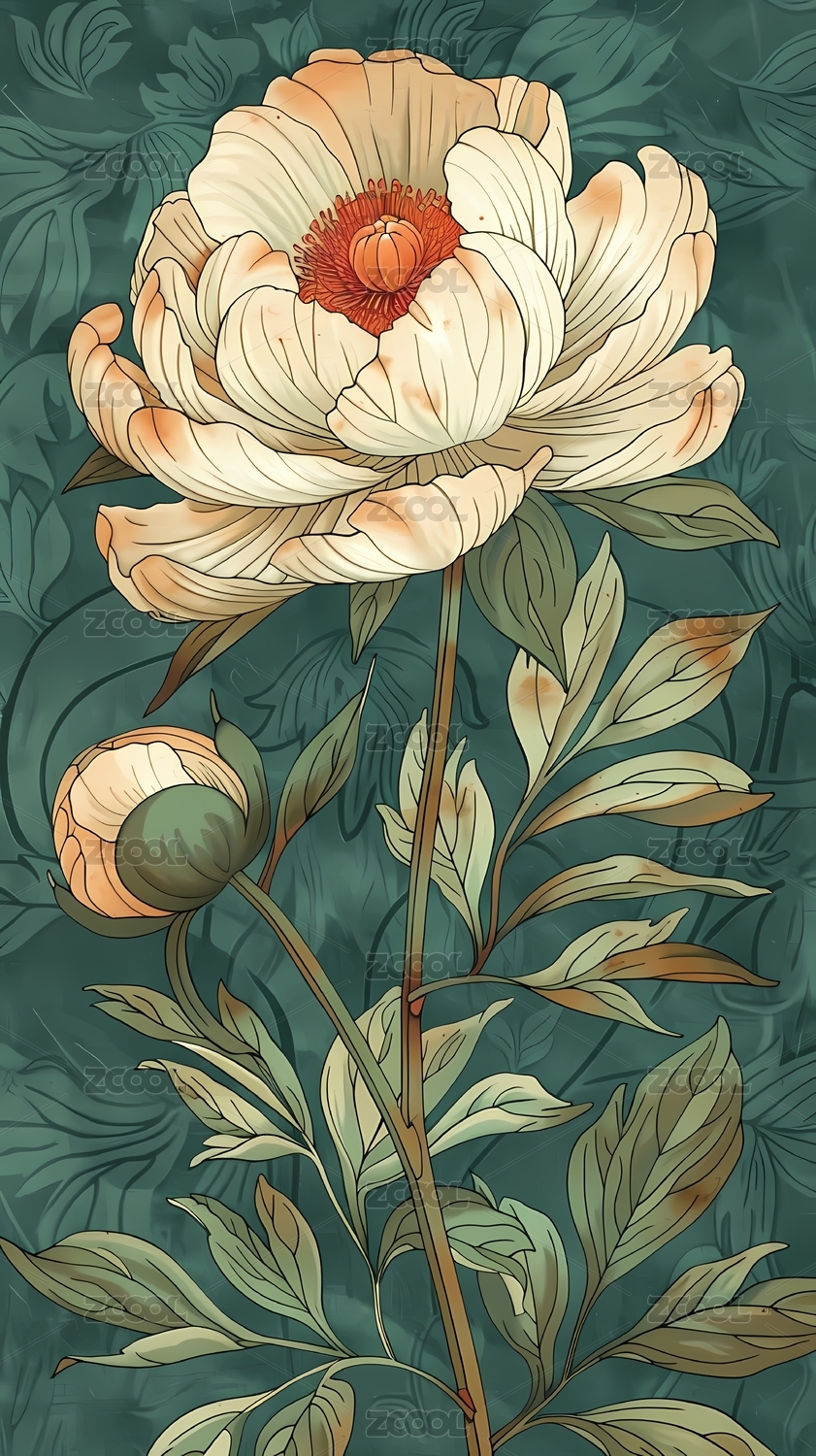 码复古牡丹和花蕾纹理图形海报手机端背景