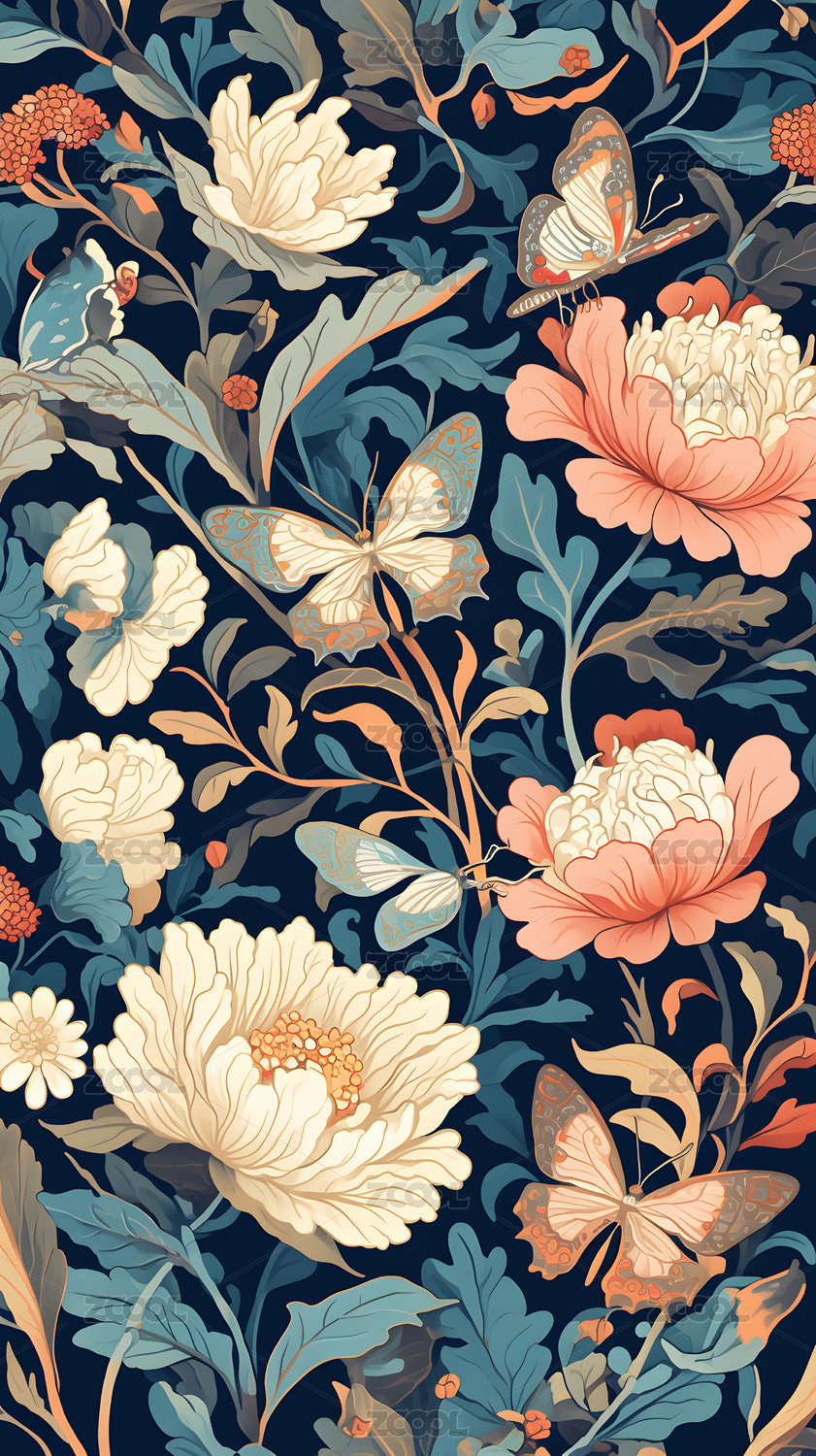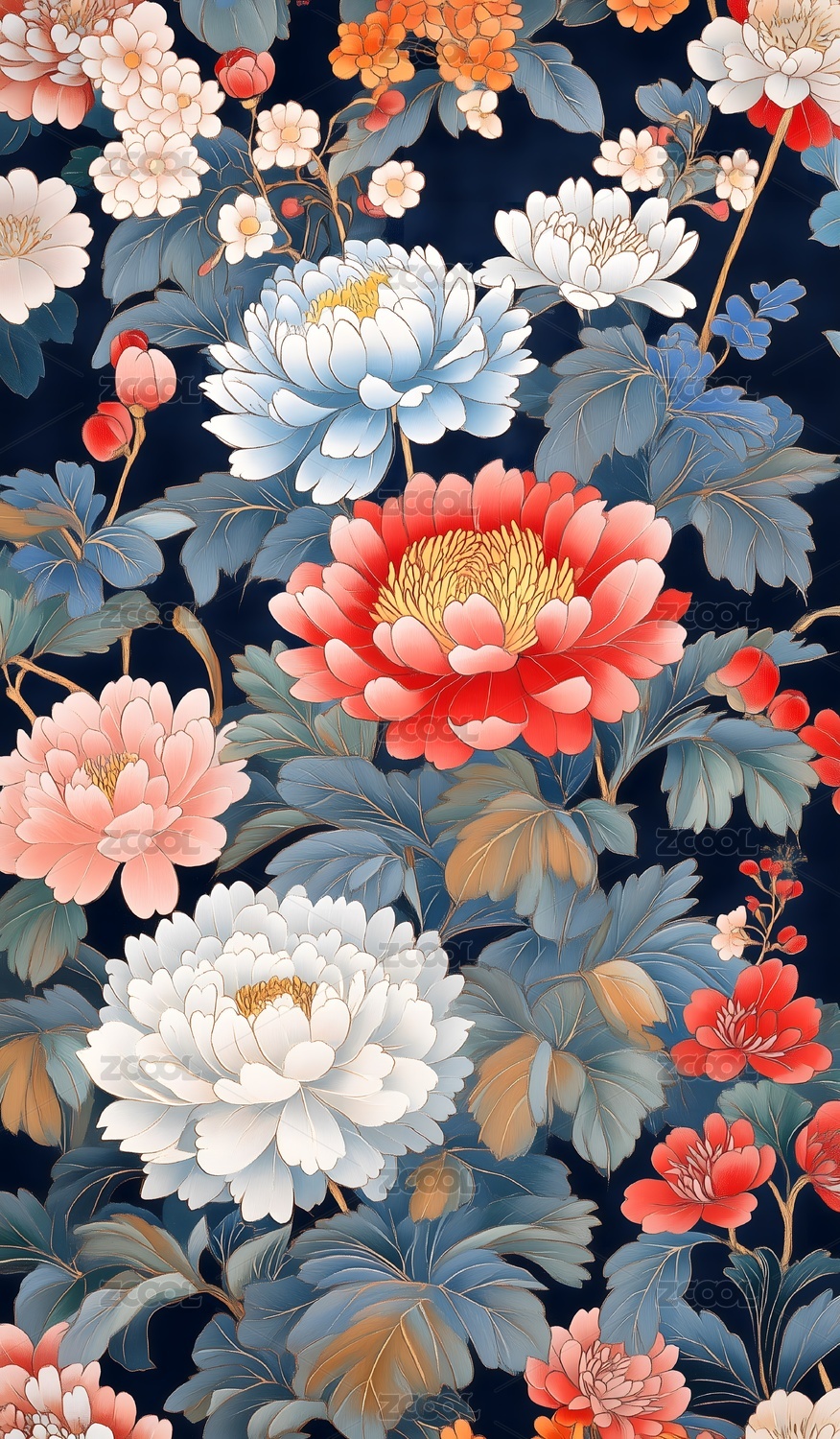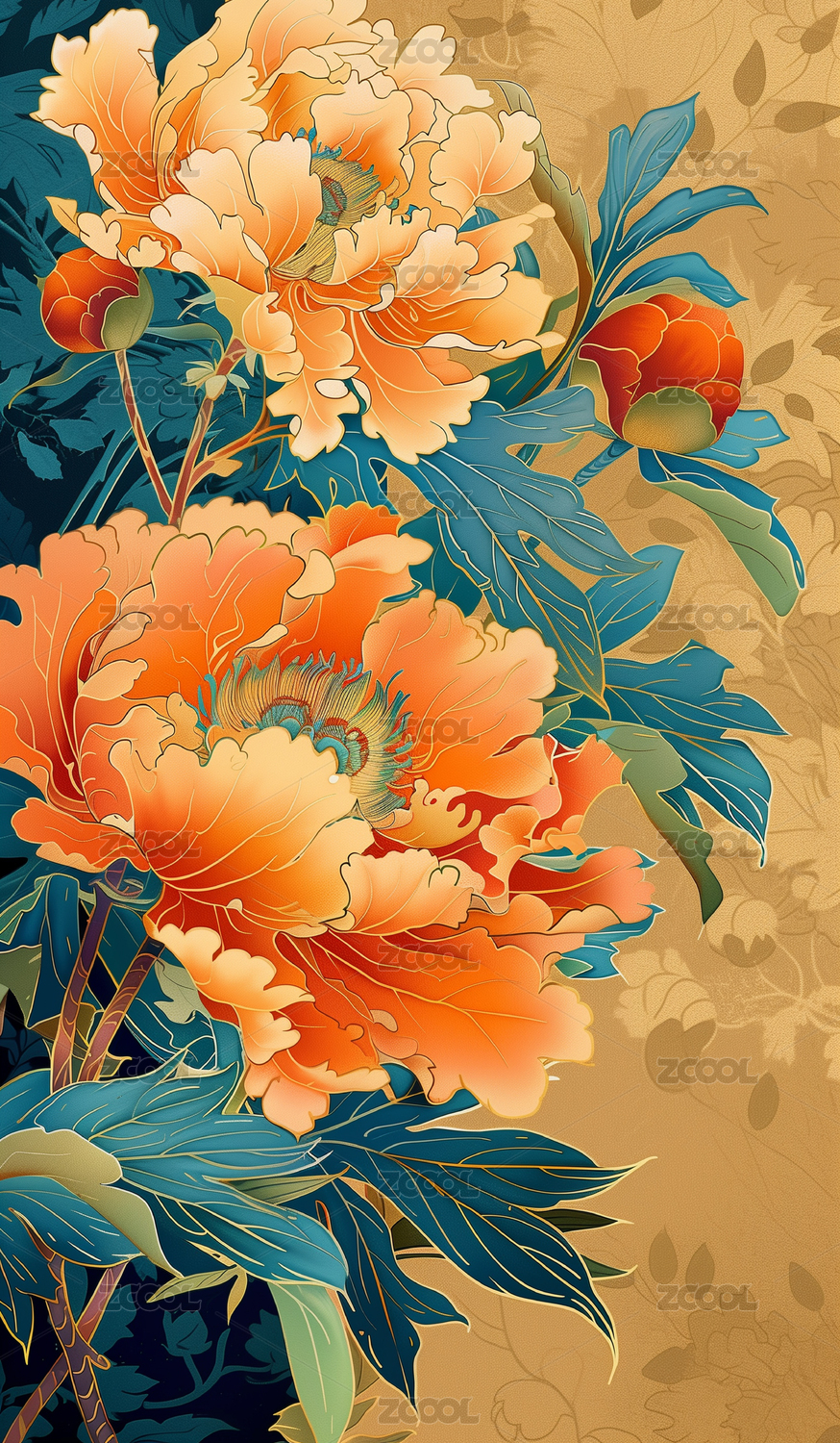 码复古牡丹和花蕾纹理图形海报手机端背景