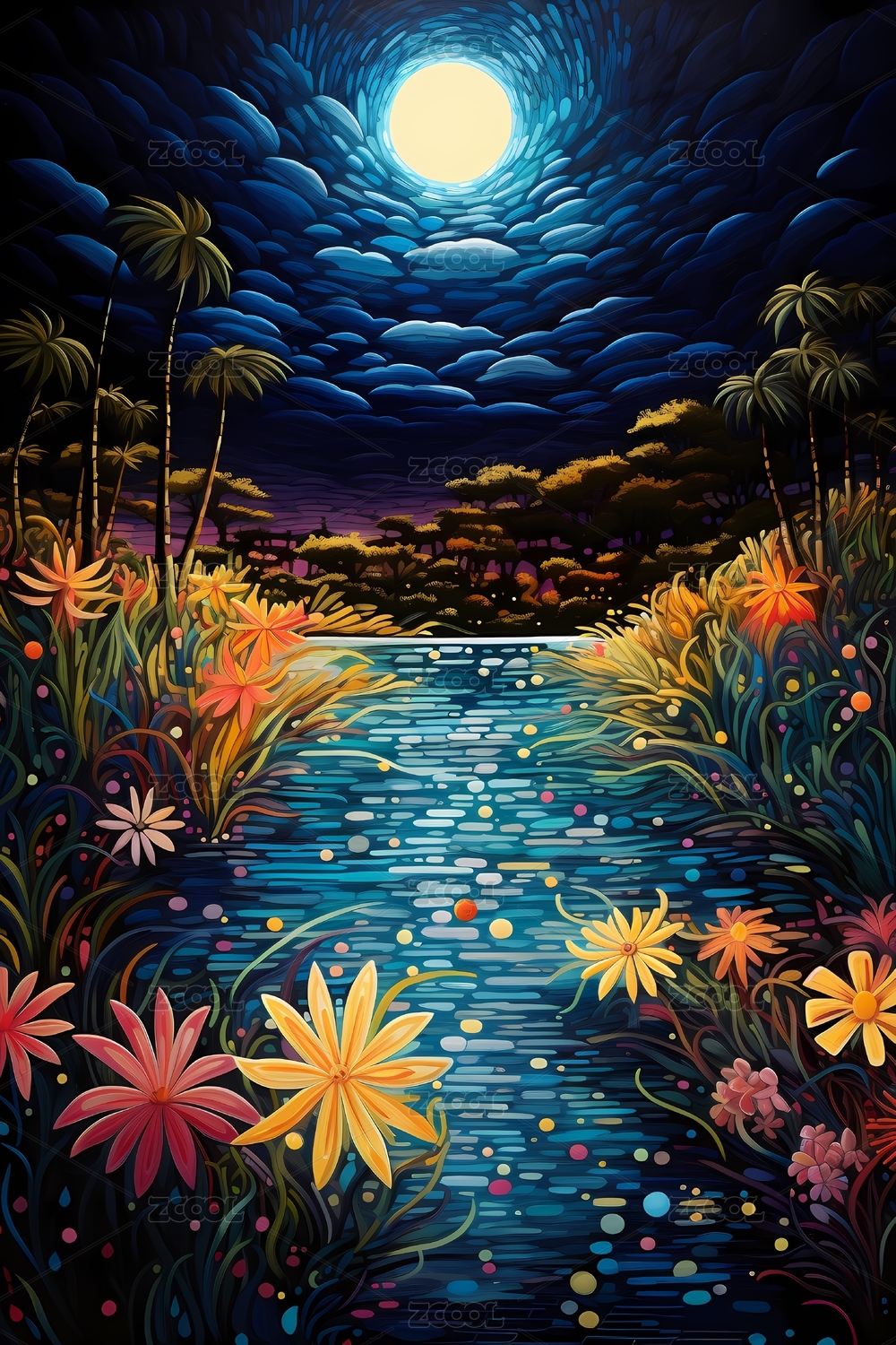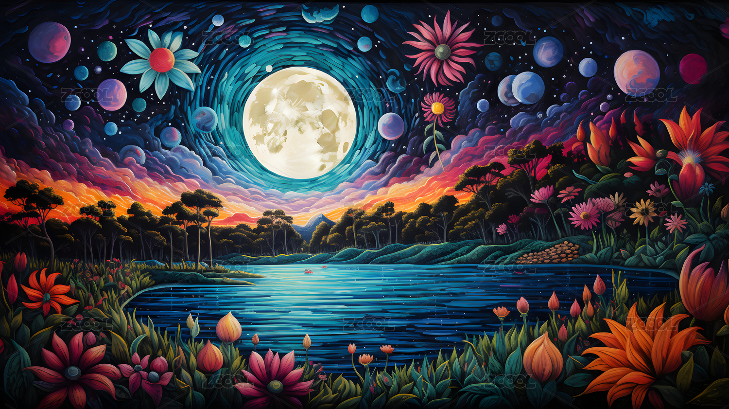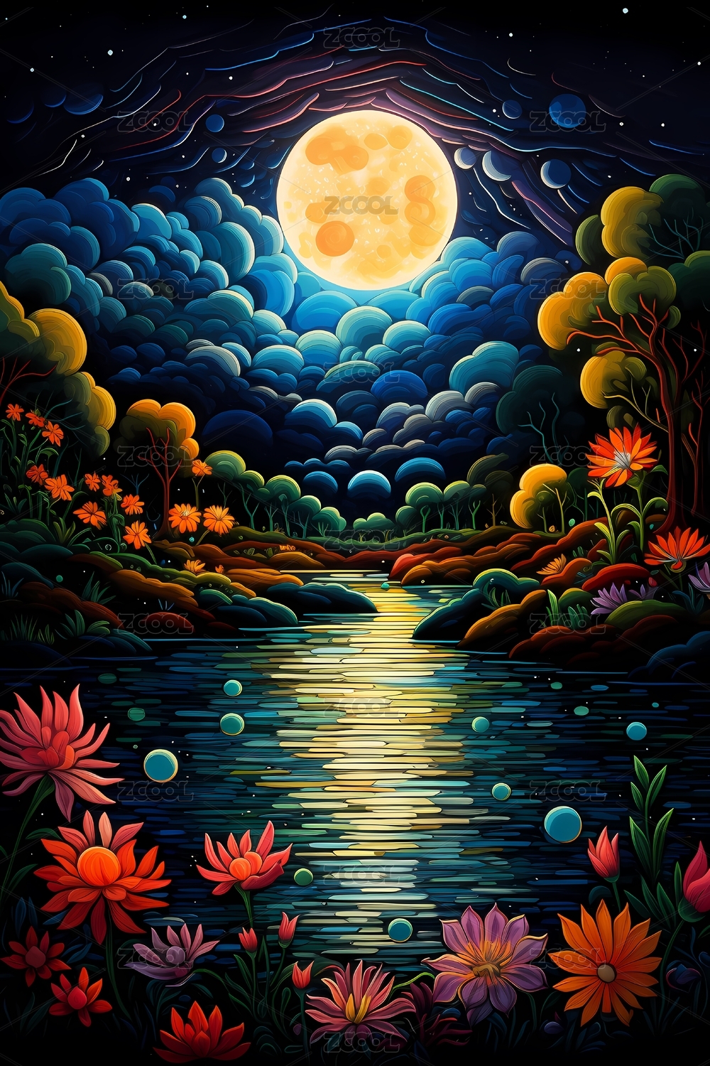 表现主义线条风格花朵月亮湖边场景插画背景