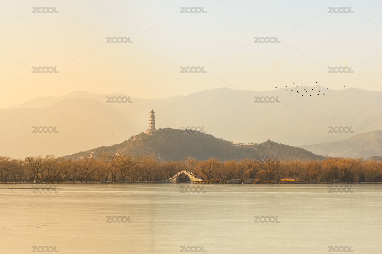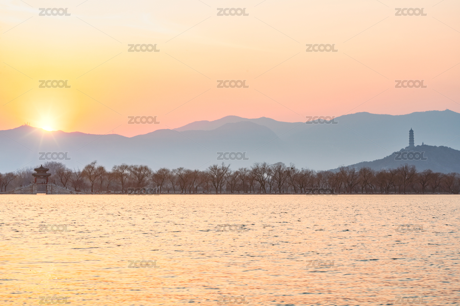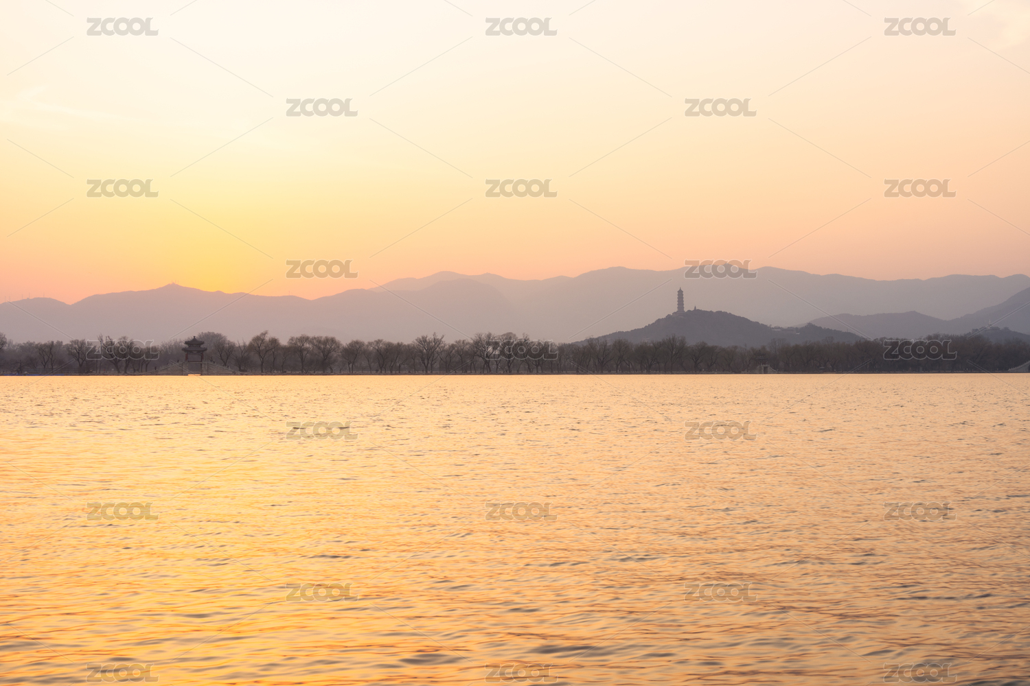 颐和园晚霞中的昆明湖和远处的玉泉塔美景