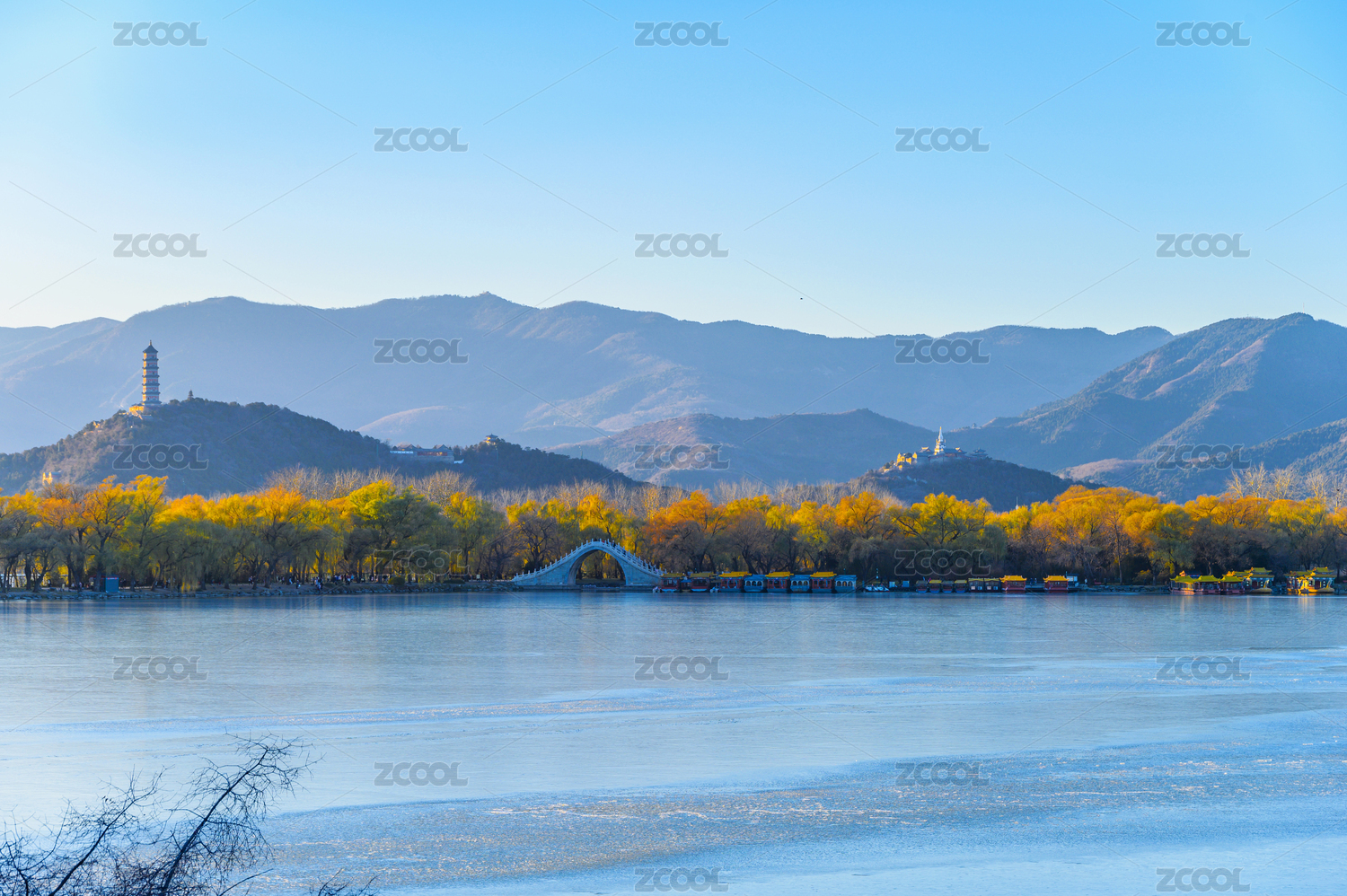 冬季蓝天下的中国北京颐和园昆明湖风光