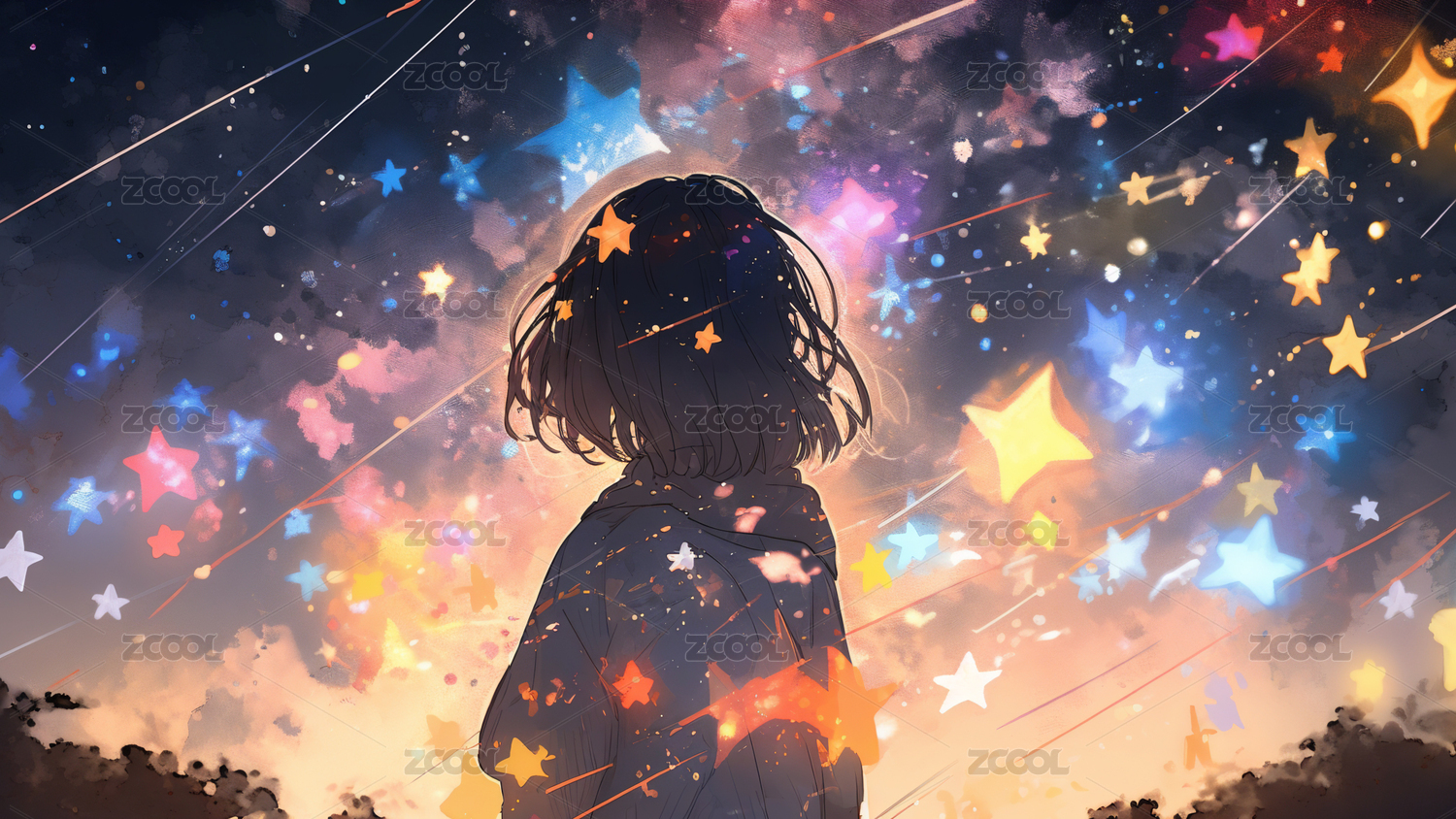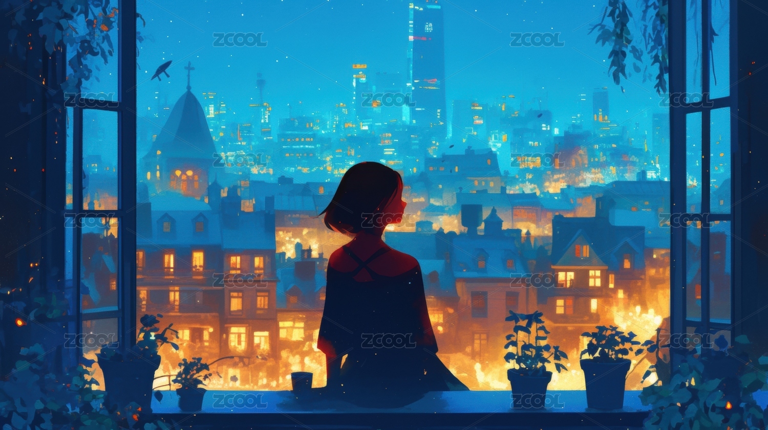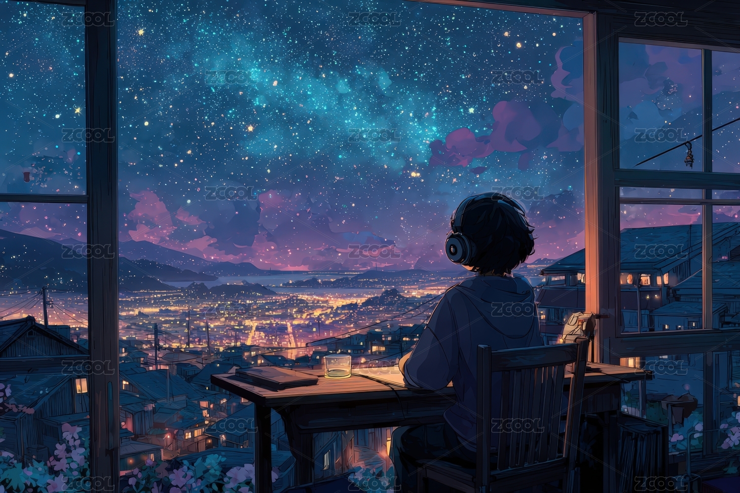 女孩,二次元,夜景,宁静,梦幻,窗户,温馨,夜晚,背影,星星