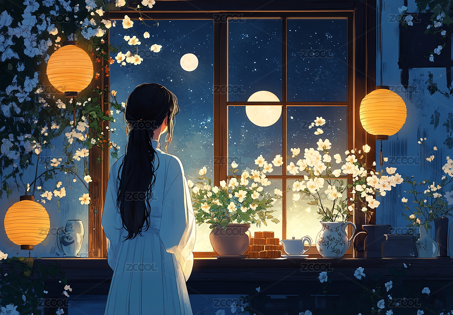 窗边少女仰望满月夜景