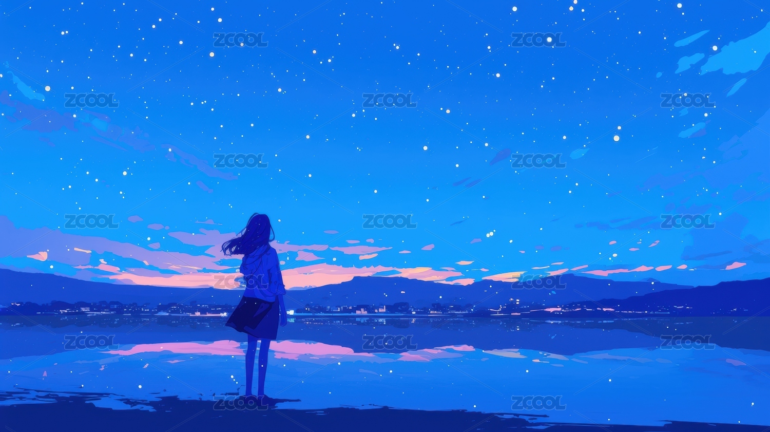 星空下的湖畔少女剪影