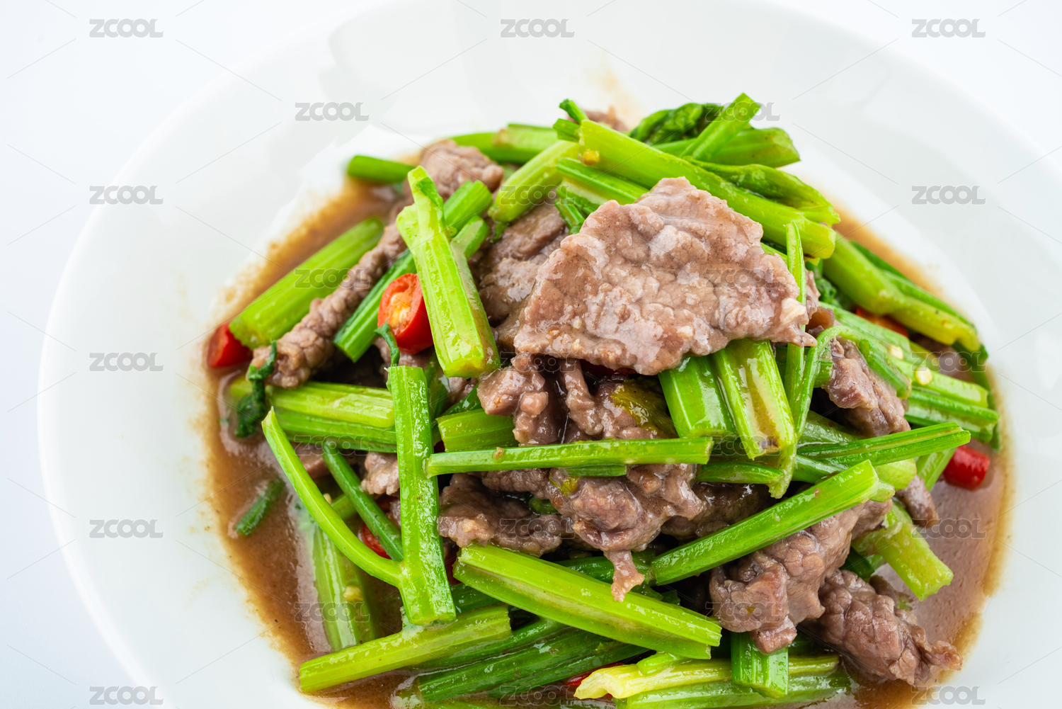 白背景上一碟芹菜炒牛肉