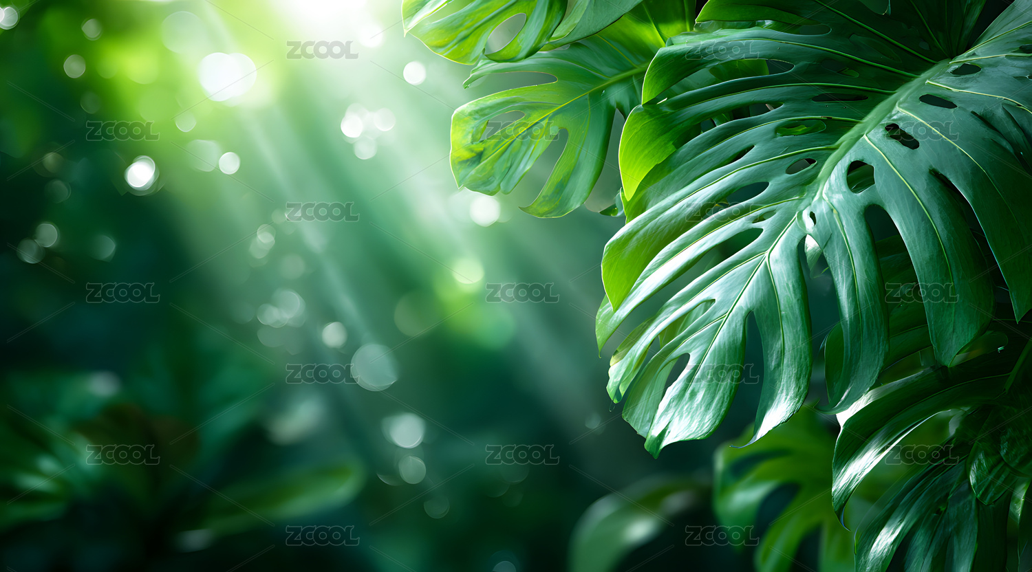 在阳光下特写新鲜绿叶具有散景效果的模糊背