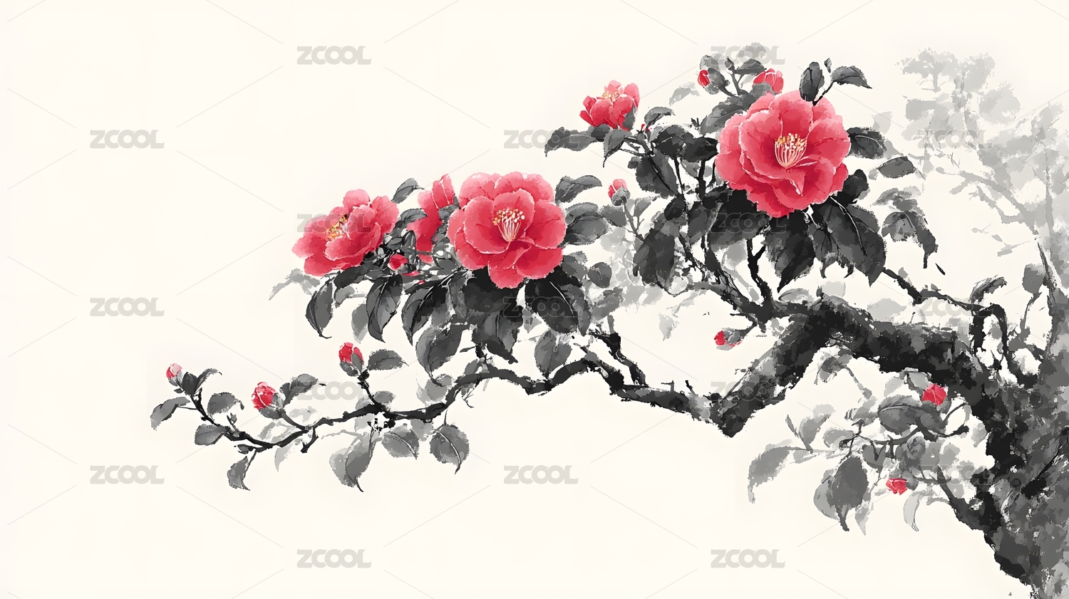 水墨绘就的艳丽盛开山茶花