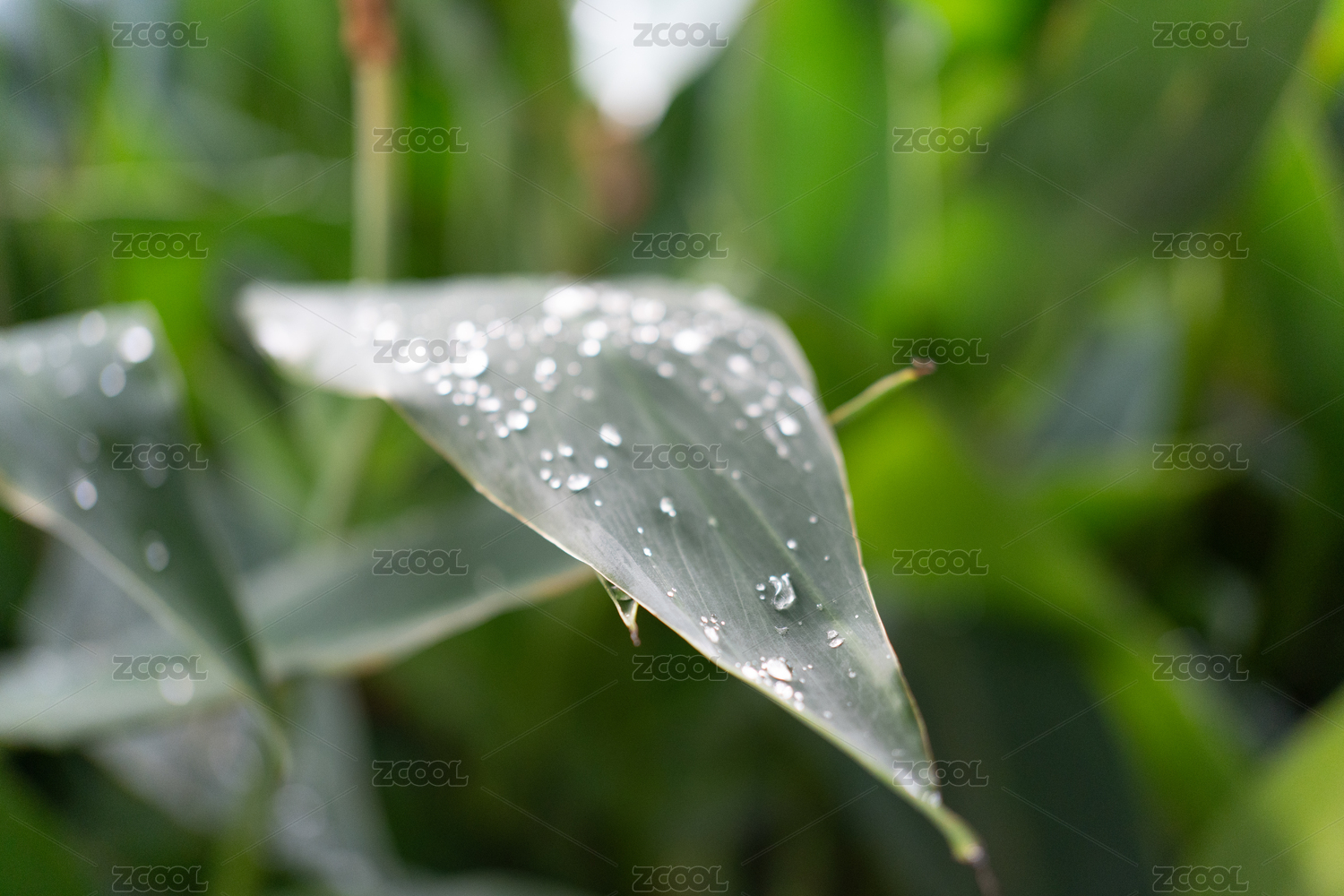 下过大雨的公园,雨滴落在绿色植物的叶子上