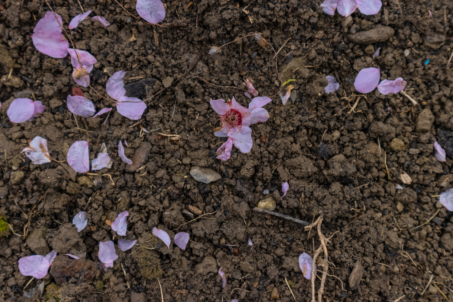春天一片粉色花瓣落在潮湿的地面上