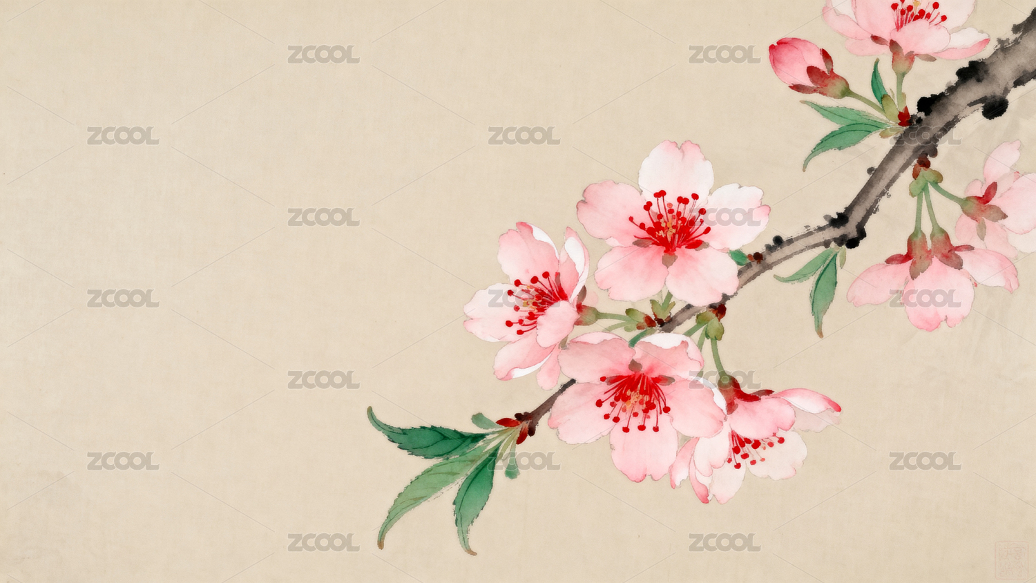 枝头桃花杏花中国水彩画风格