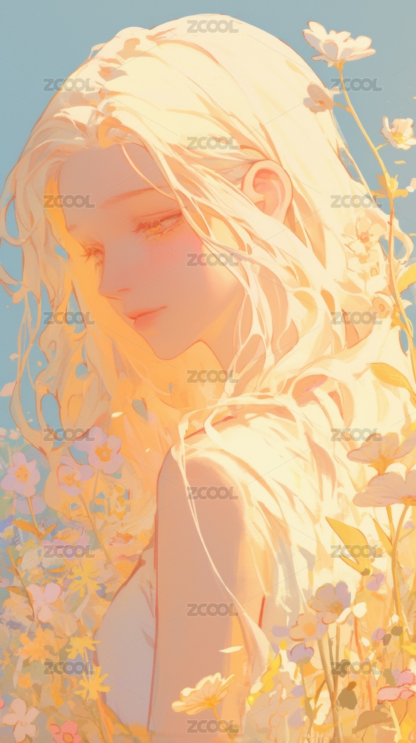 金色长发少女置身花丛