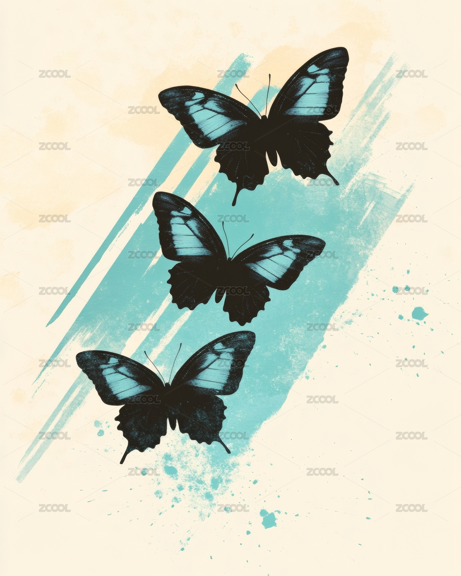 三只黑蓝相间蝴蝶于彩墨背景飞舞