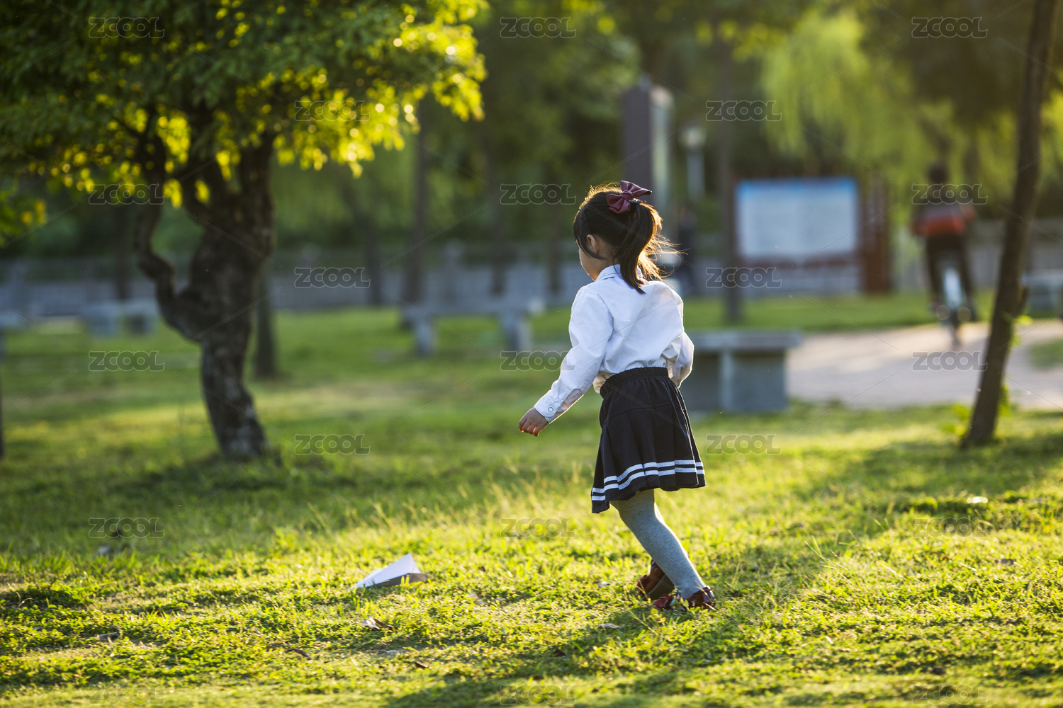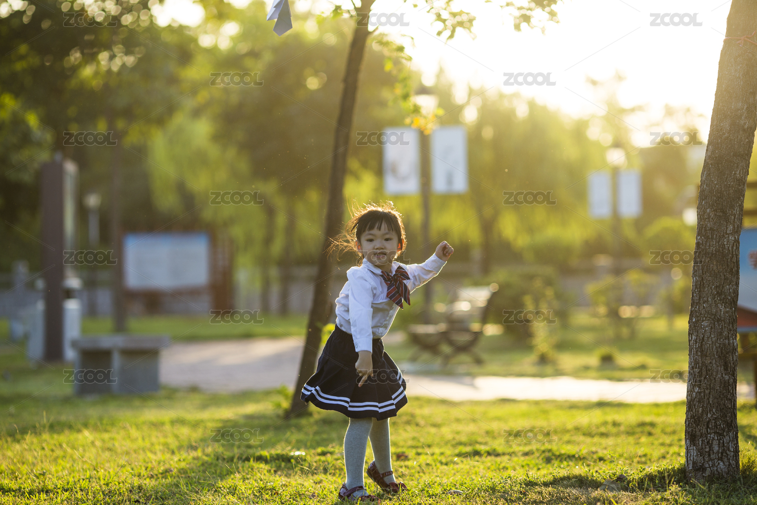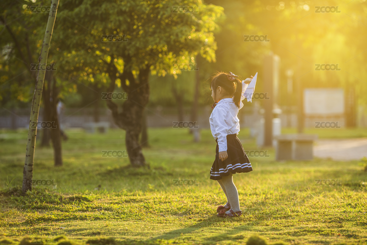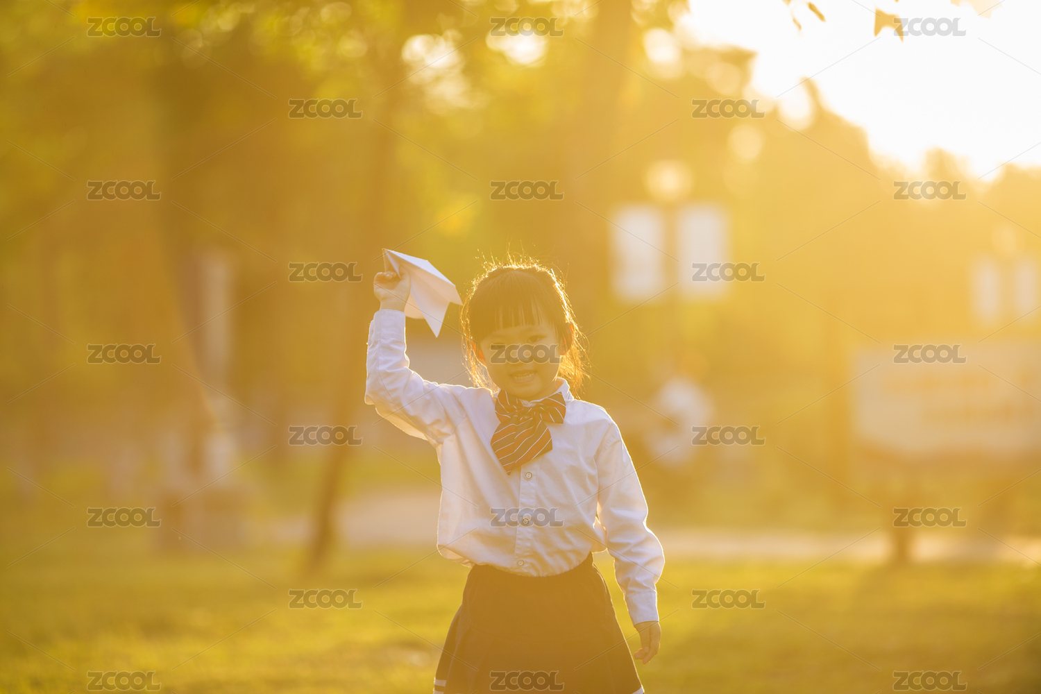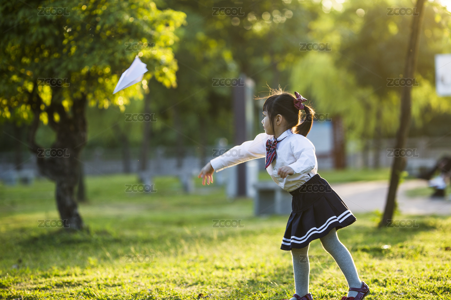 女孩子放学后在公园玩纸飞机