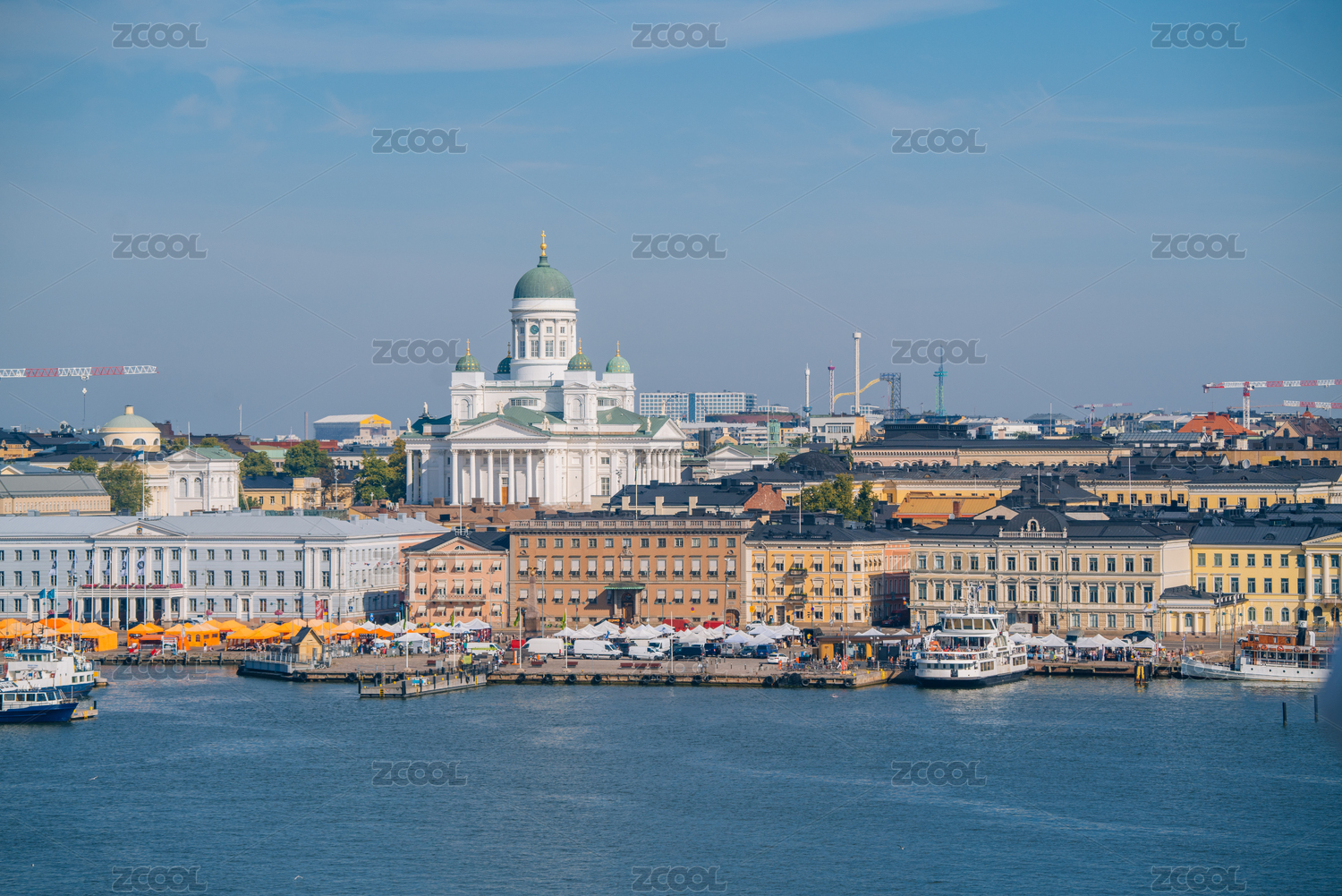 从海上眺望雄伟的芬兰赫尔辛基大教堂与城市