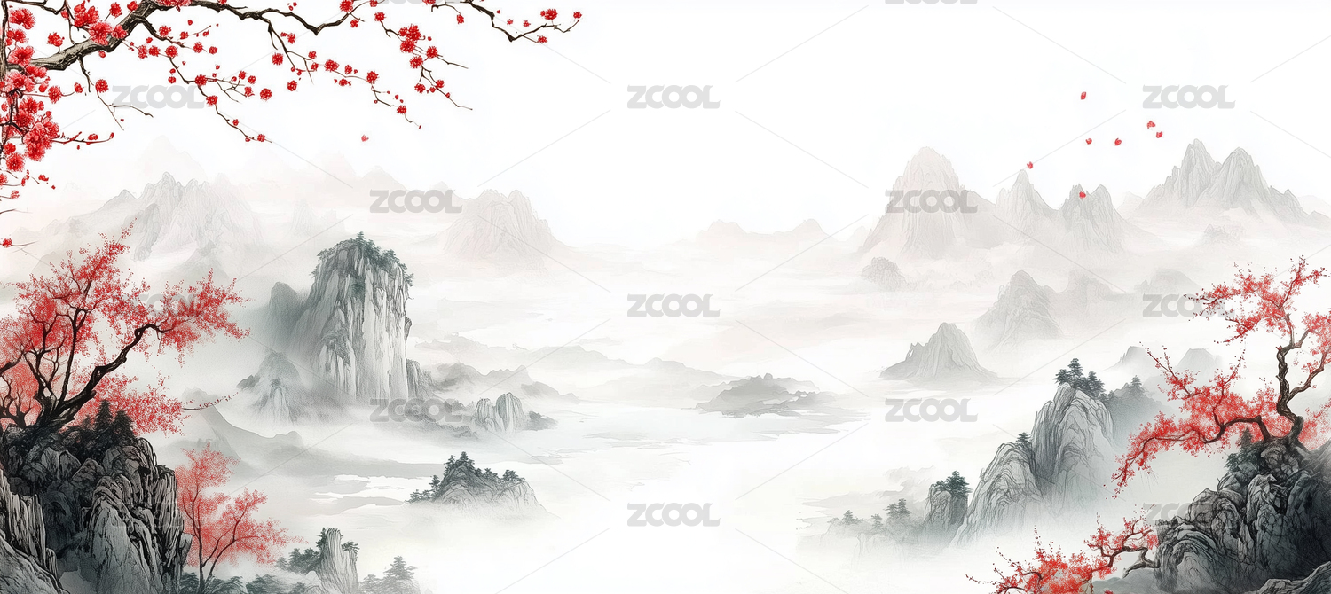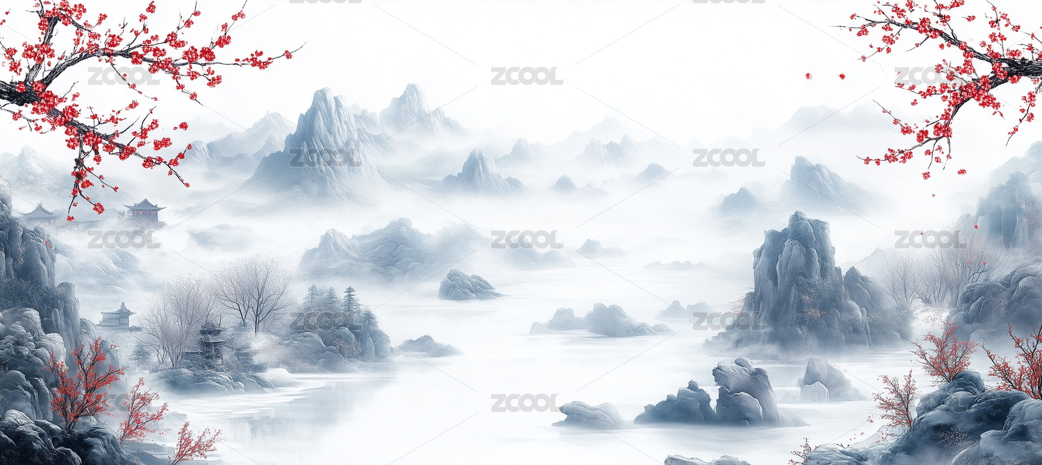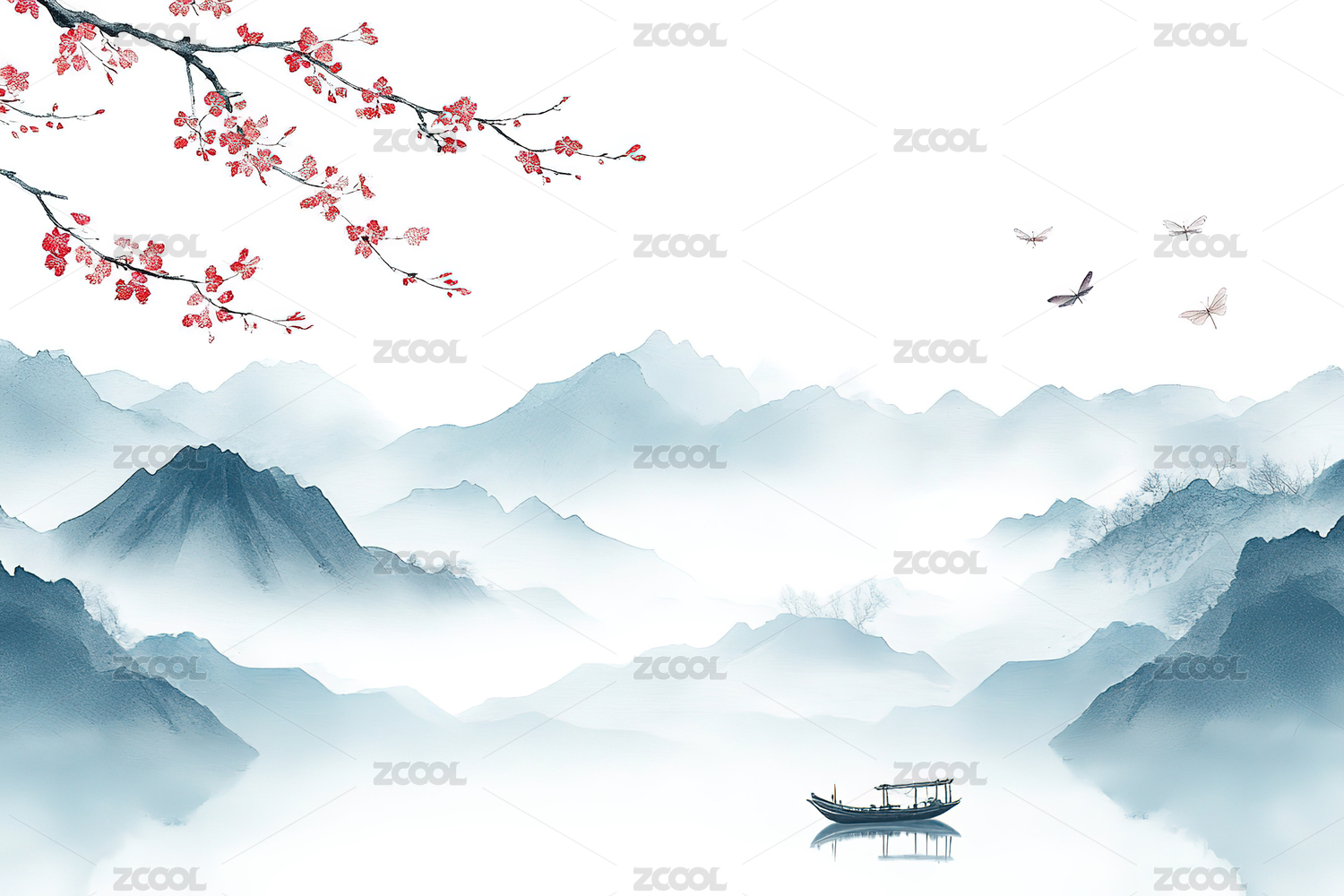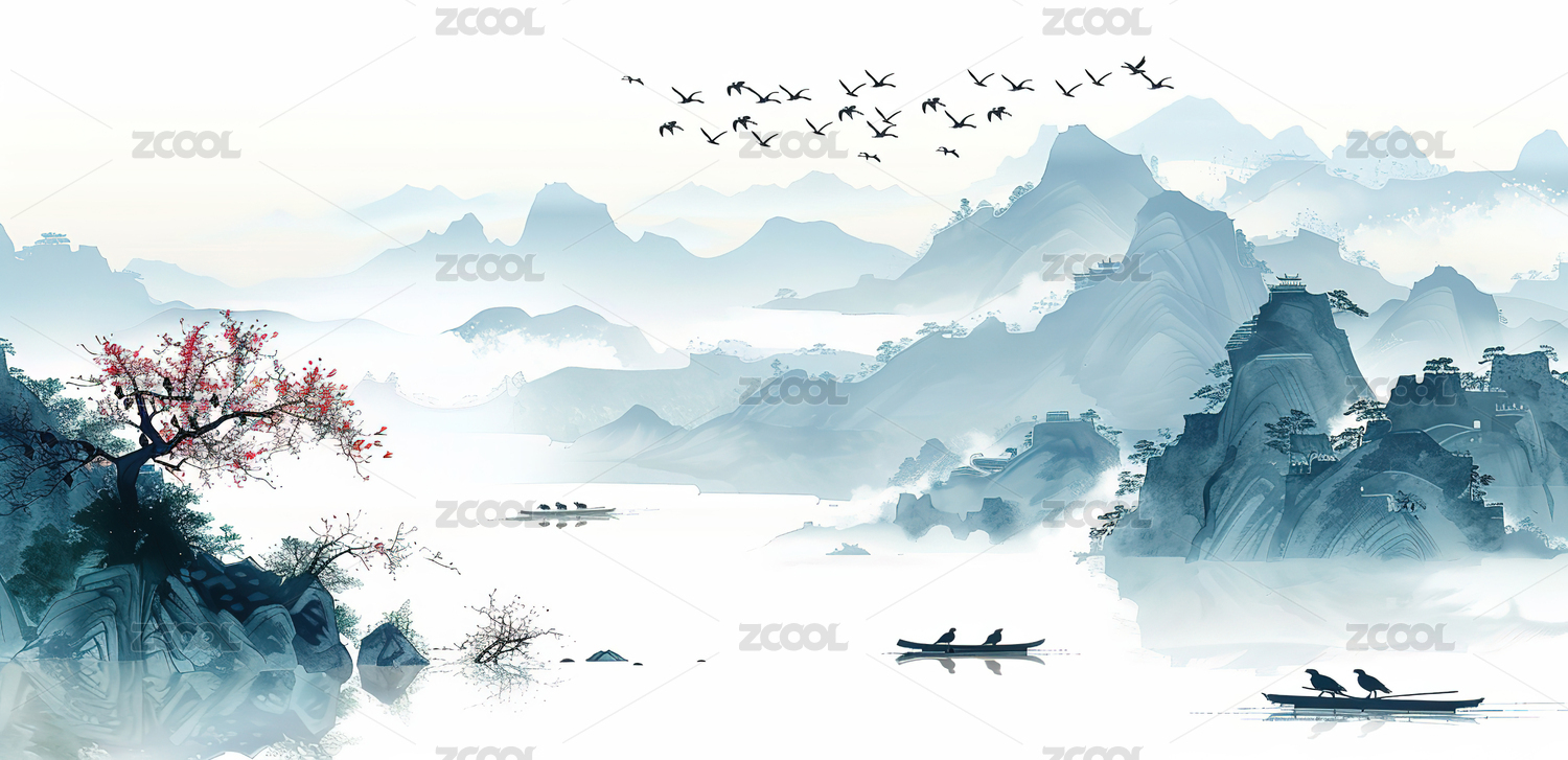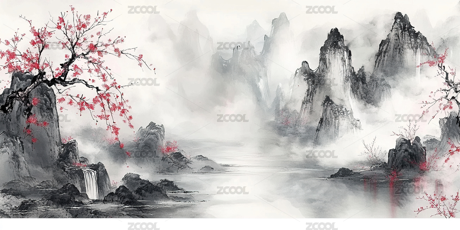 中国风,水墨,山水画,新中式,山水,黑白,背景,手绘,装饰画,插画