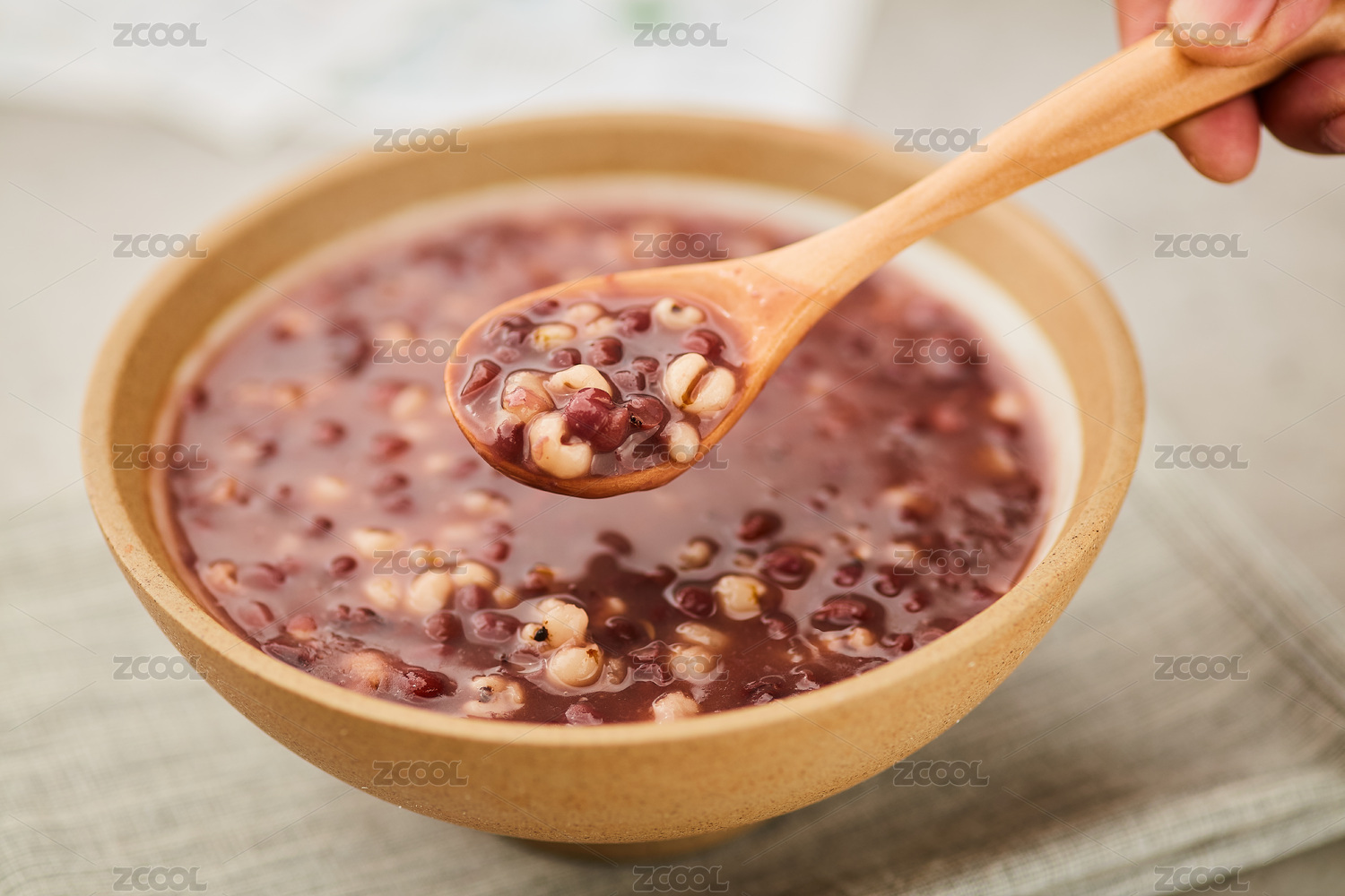 复古场景中装在碗里的五谷腊八粥用木勺舀起