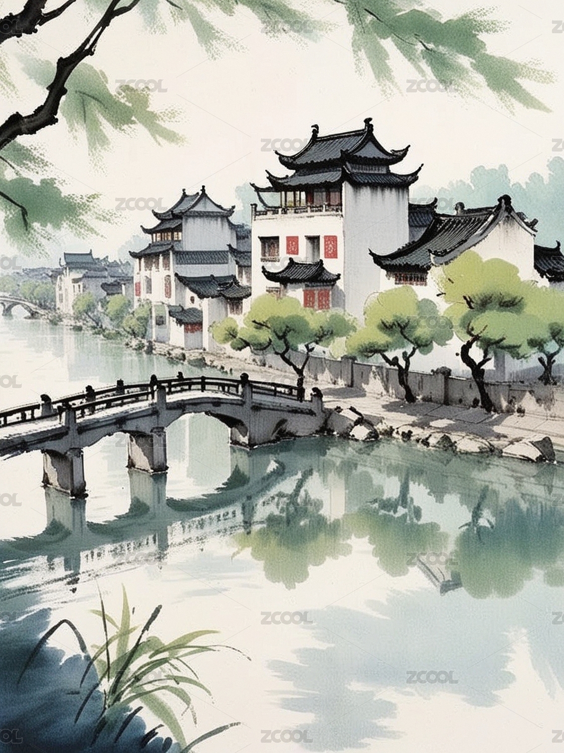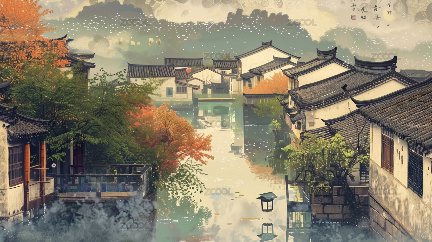 中国风,水墨画,水彩,艺术,江南水乡,白墙灰瓦,树,柿子,街道,小巷子