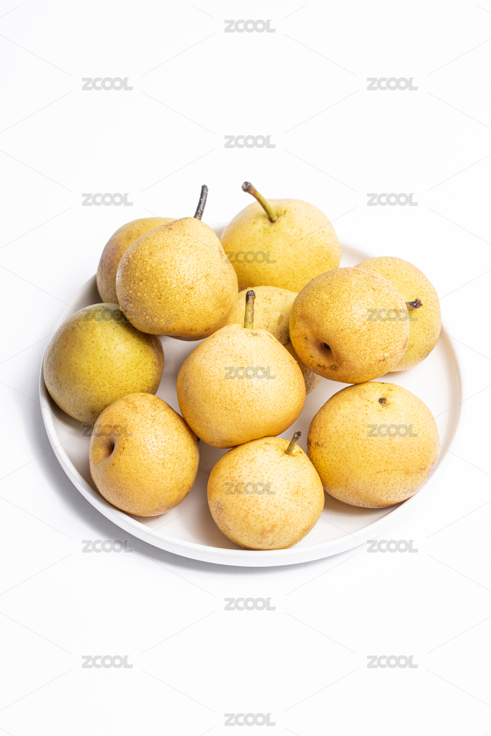 清新背景上放着一盘砀山梨和砀山梨果肉