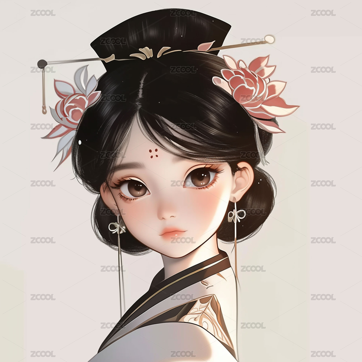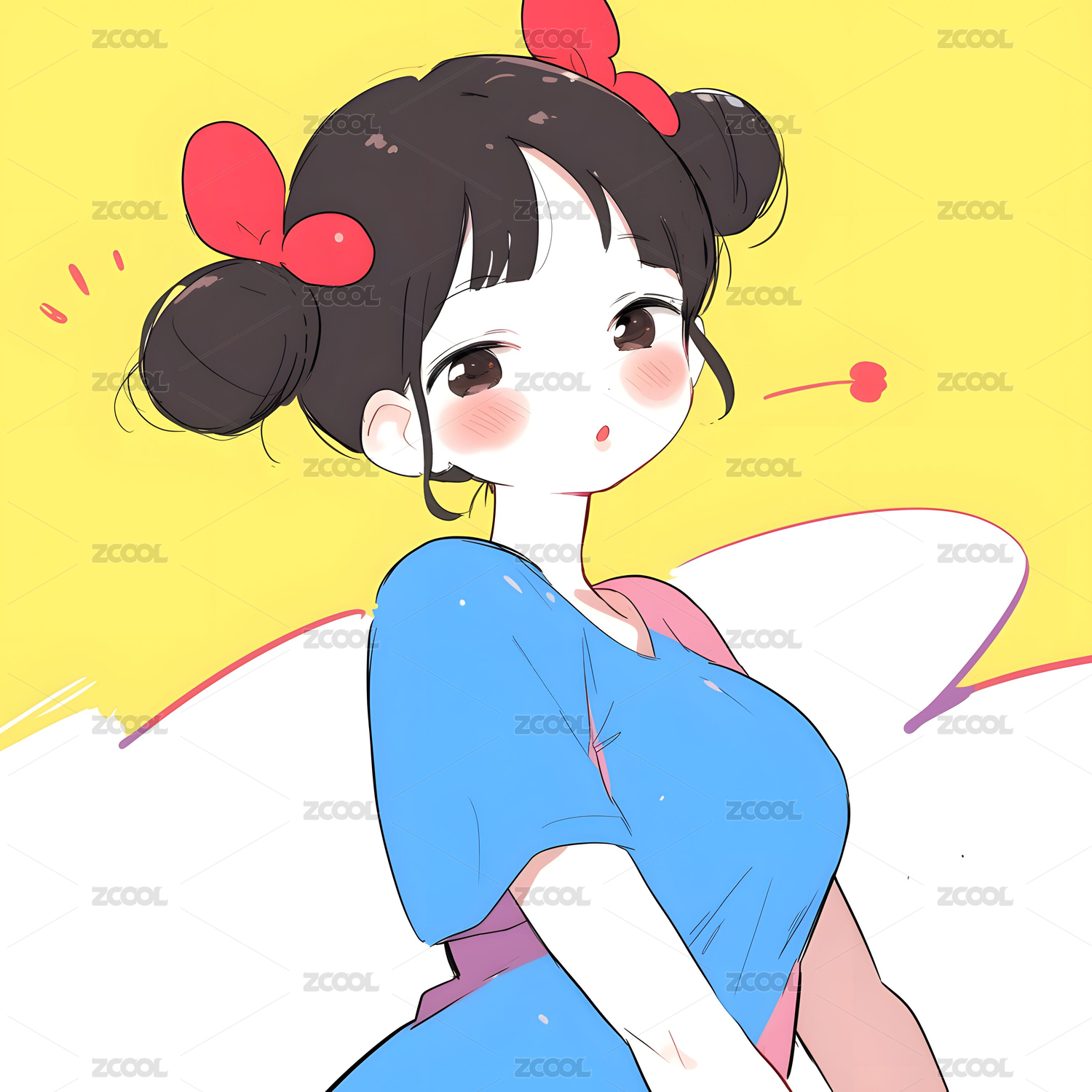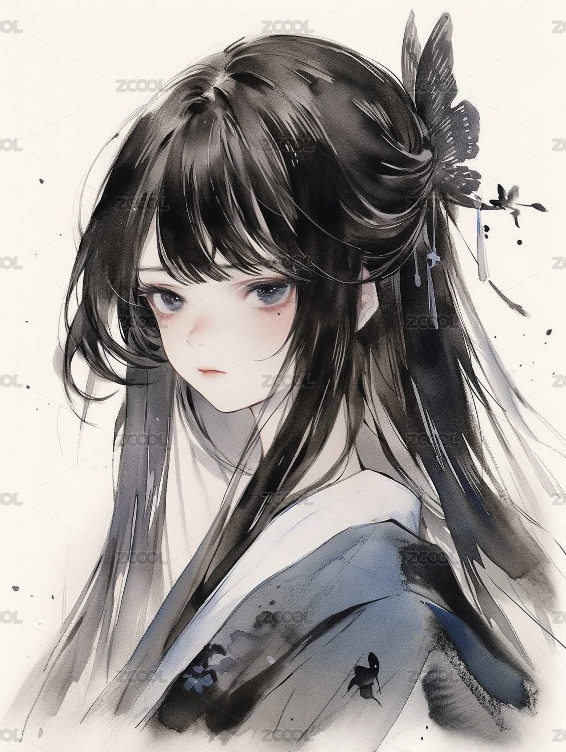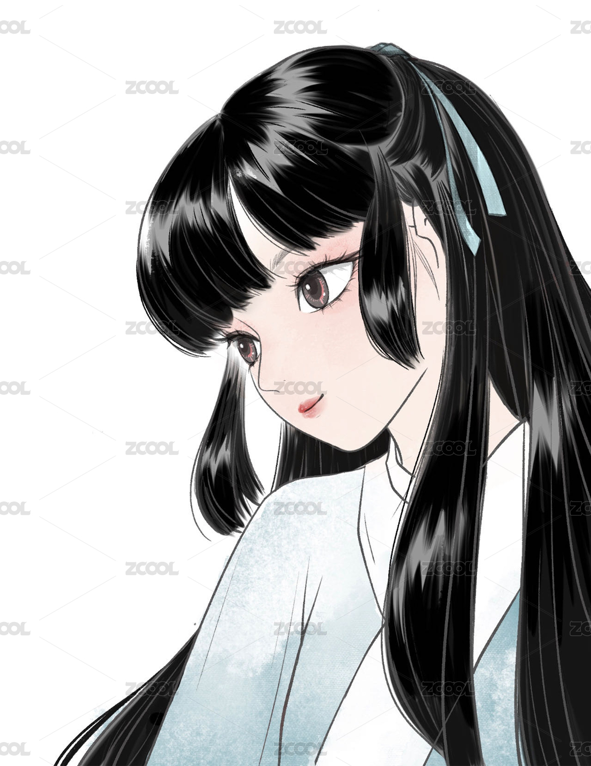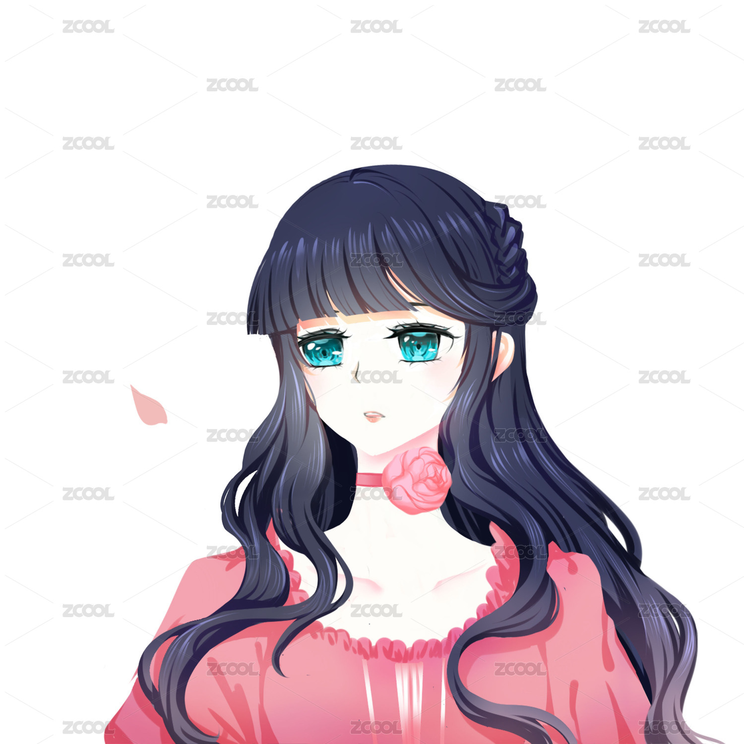 黑发蓝眼睛的美少女头像,二次元风格插画