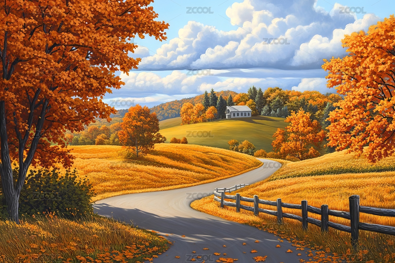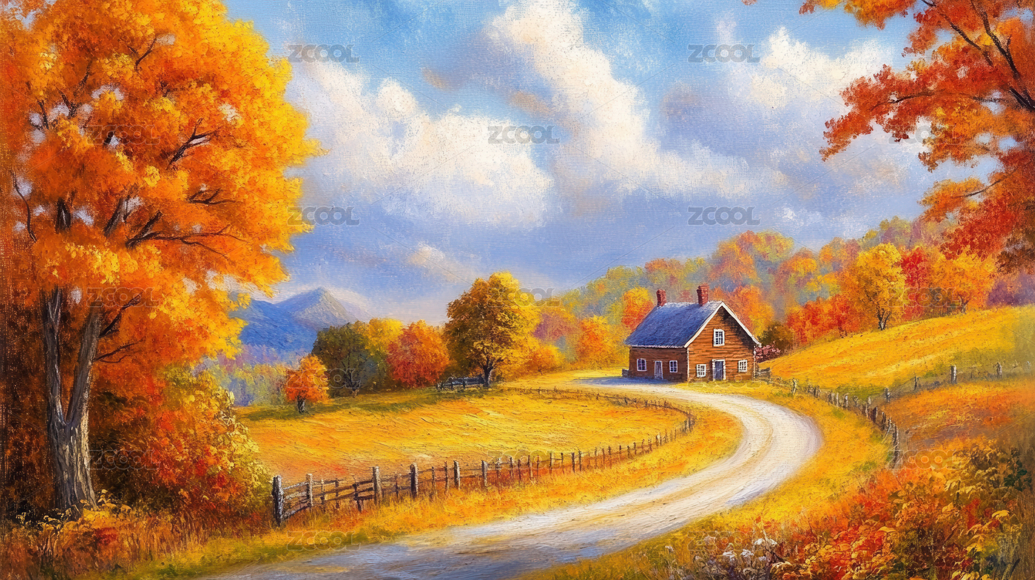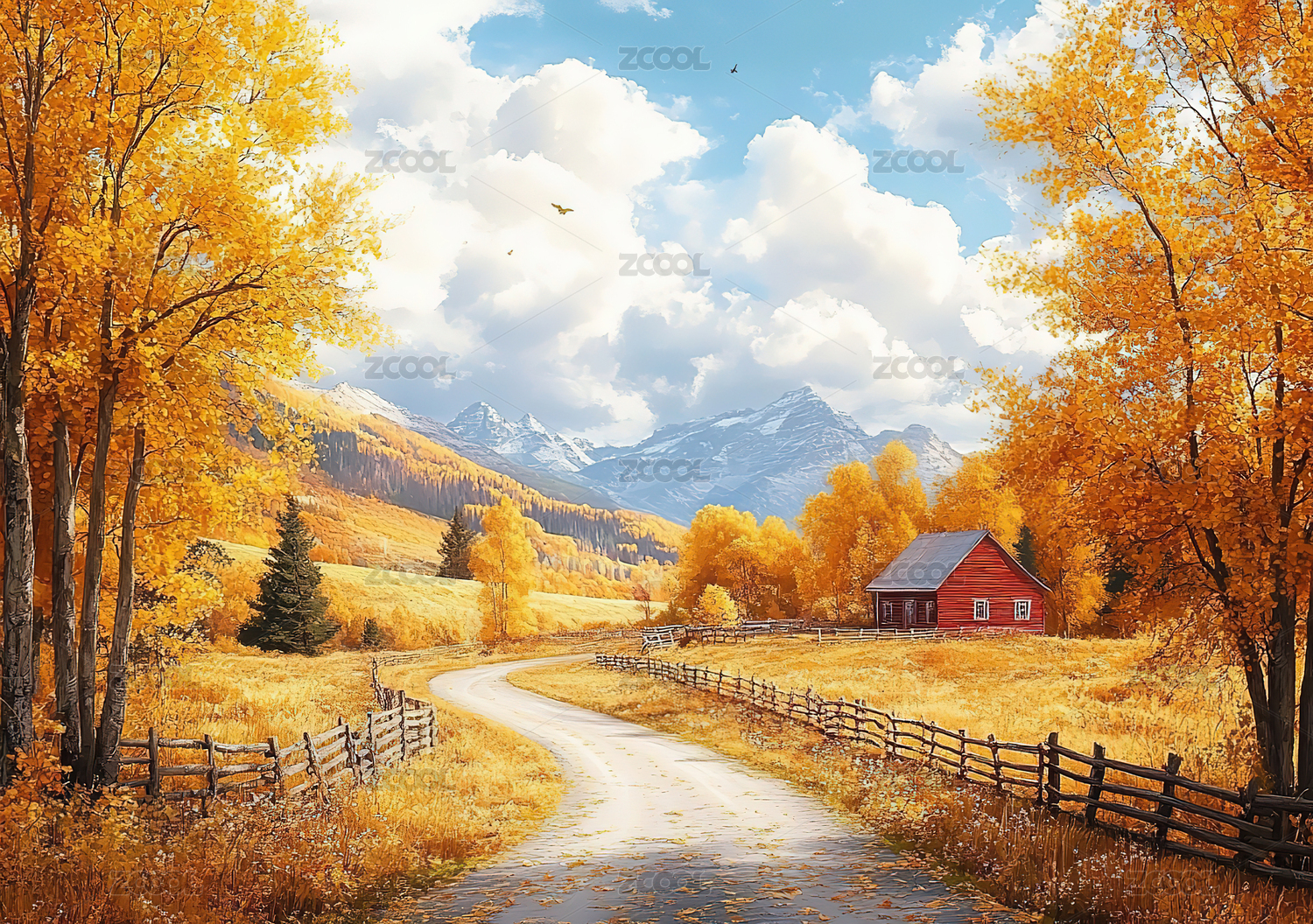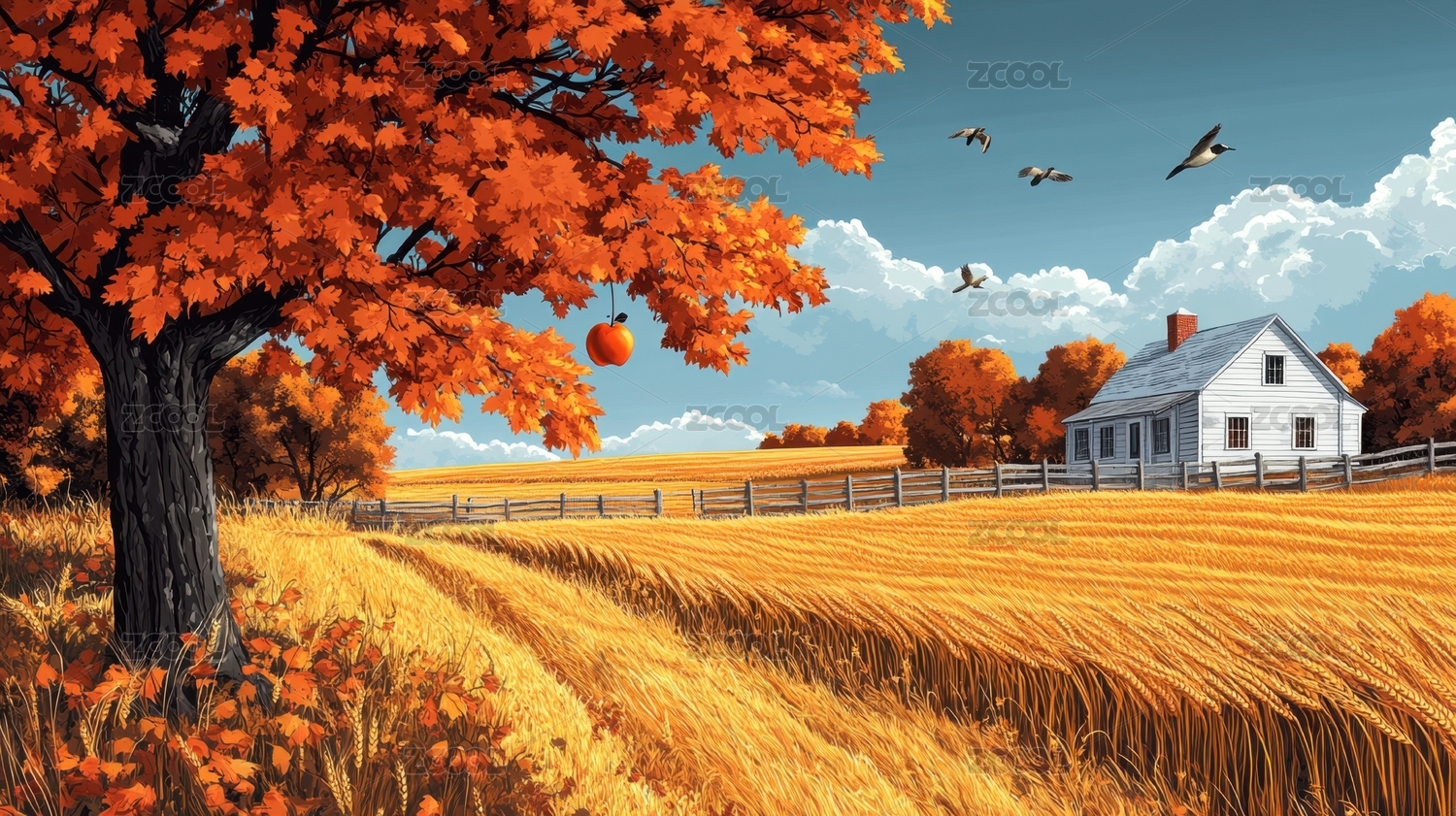 马群,秋天,木屋,风景,插画,旅游,旅行,AIGC202404