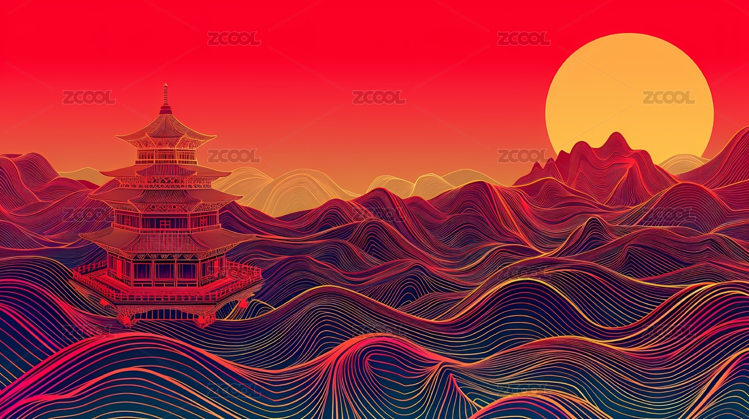 中国风古楼建筑传统国风古建筑国潮插画背景