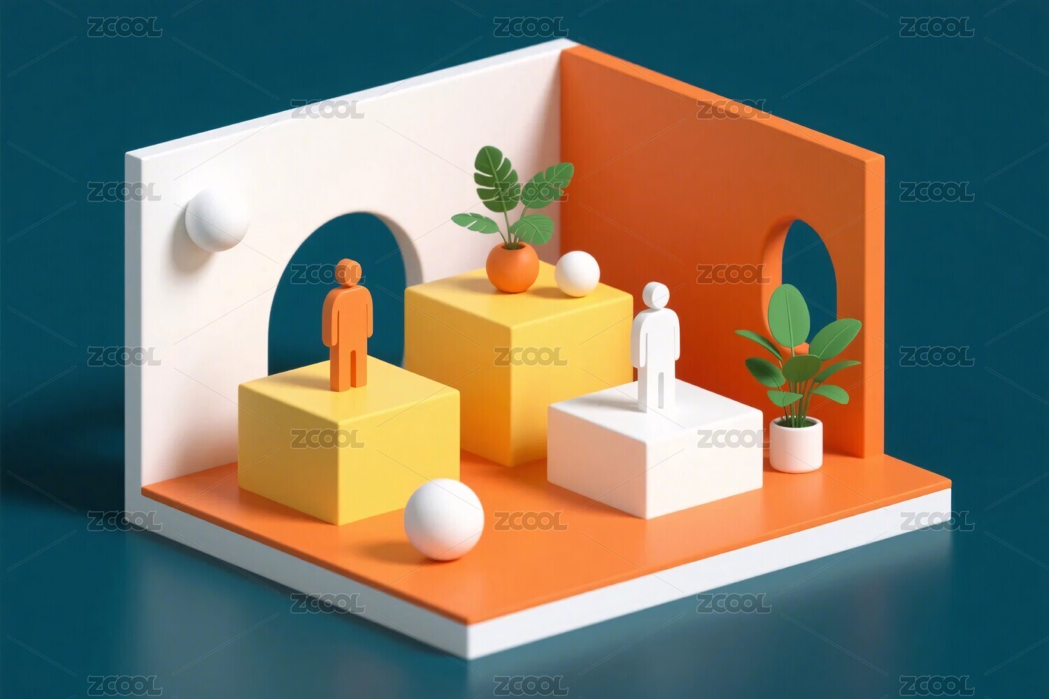 立体场景中的人物与绿植模型