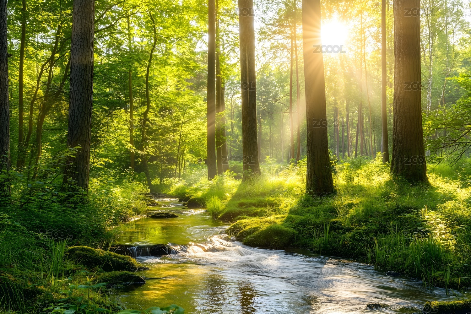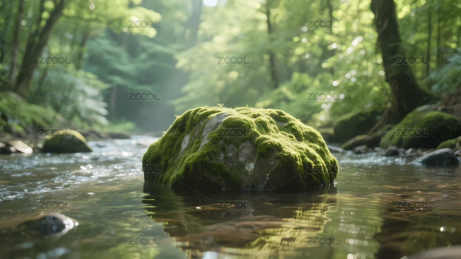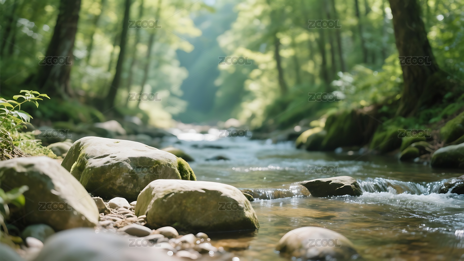 绿意盎然的丛林中缓缓流淌的小溪特写