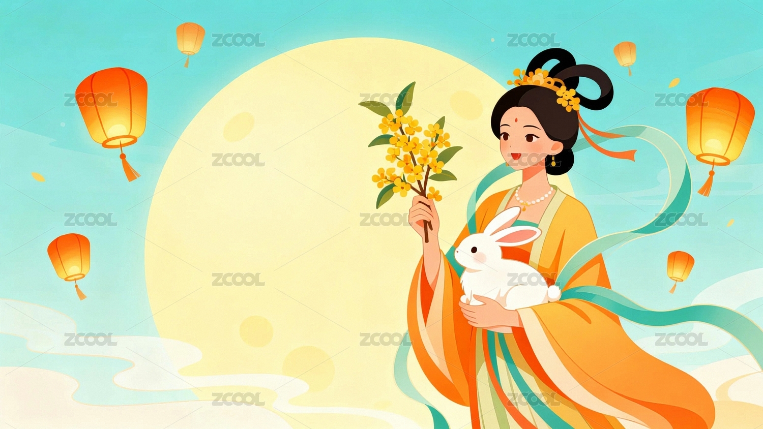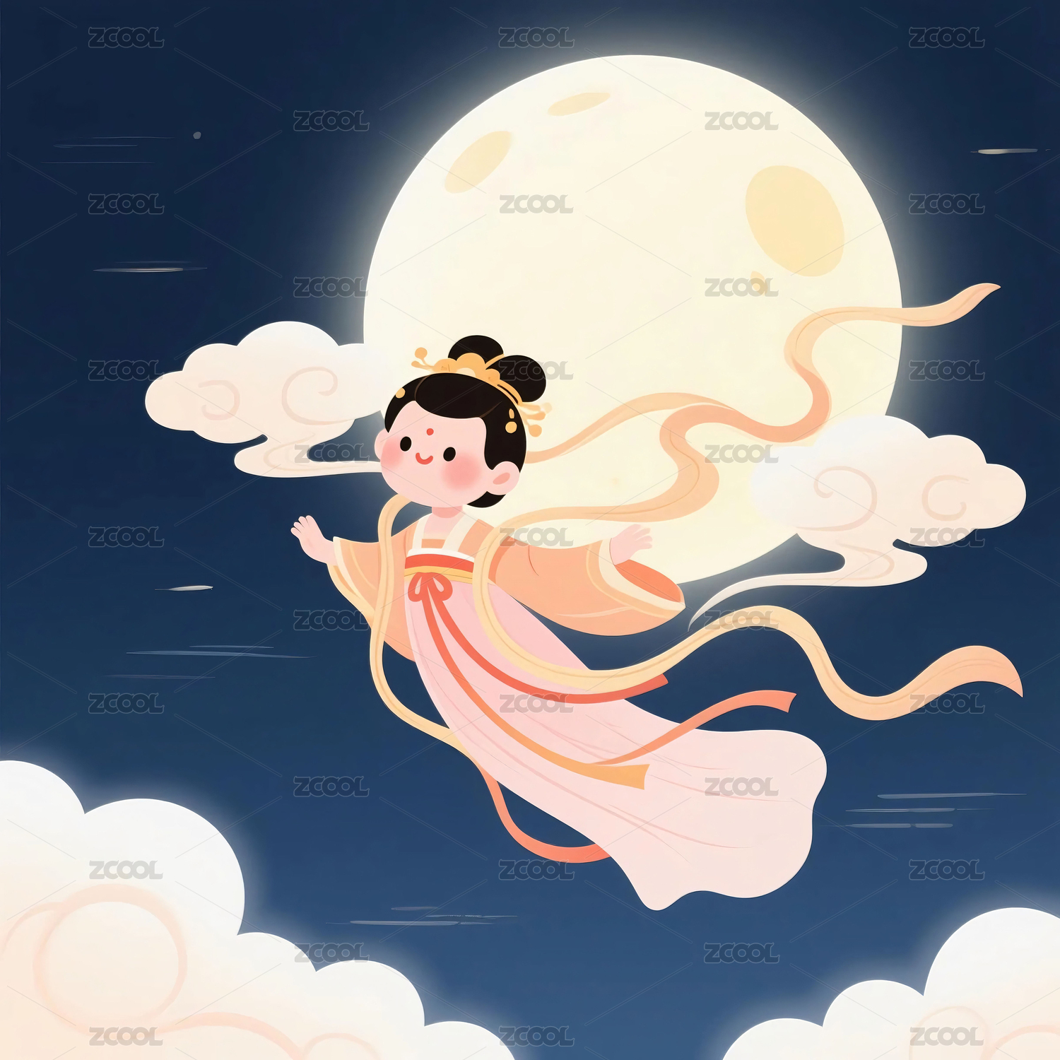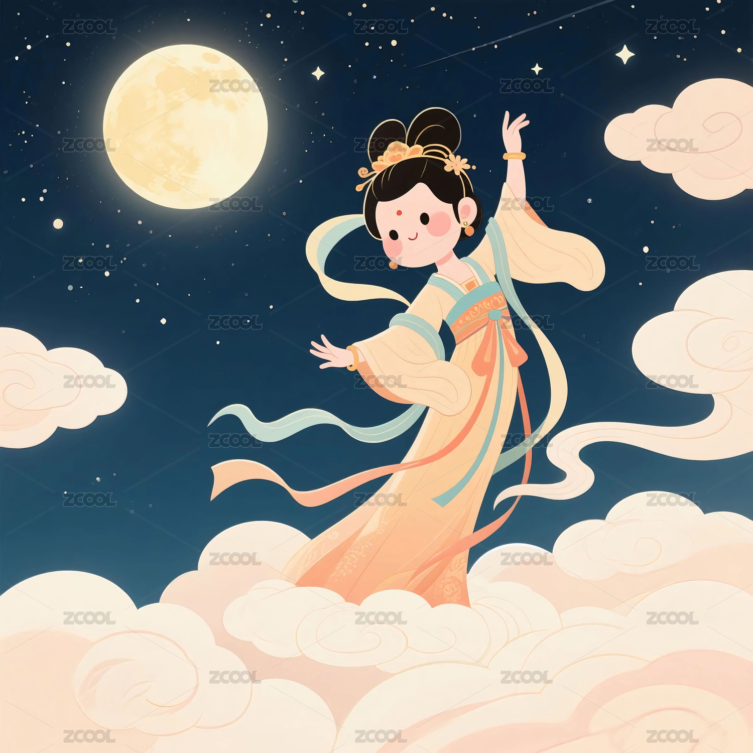 中秋节海报国风Q版卡通插画嫦娥在月下跳舞