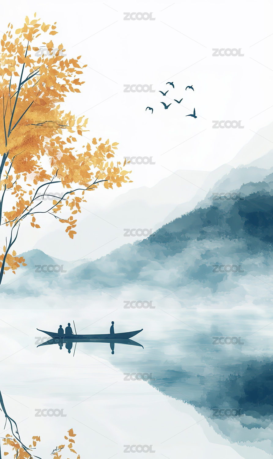 插画,山峰,水墨,春天,中国风,早晨,森林,山谷,江南,划船