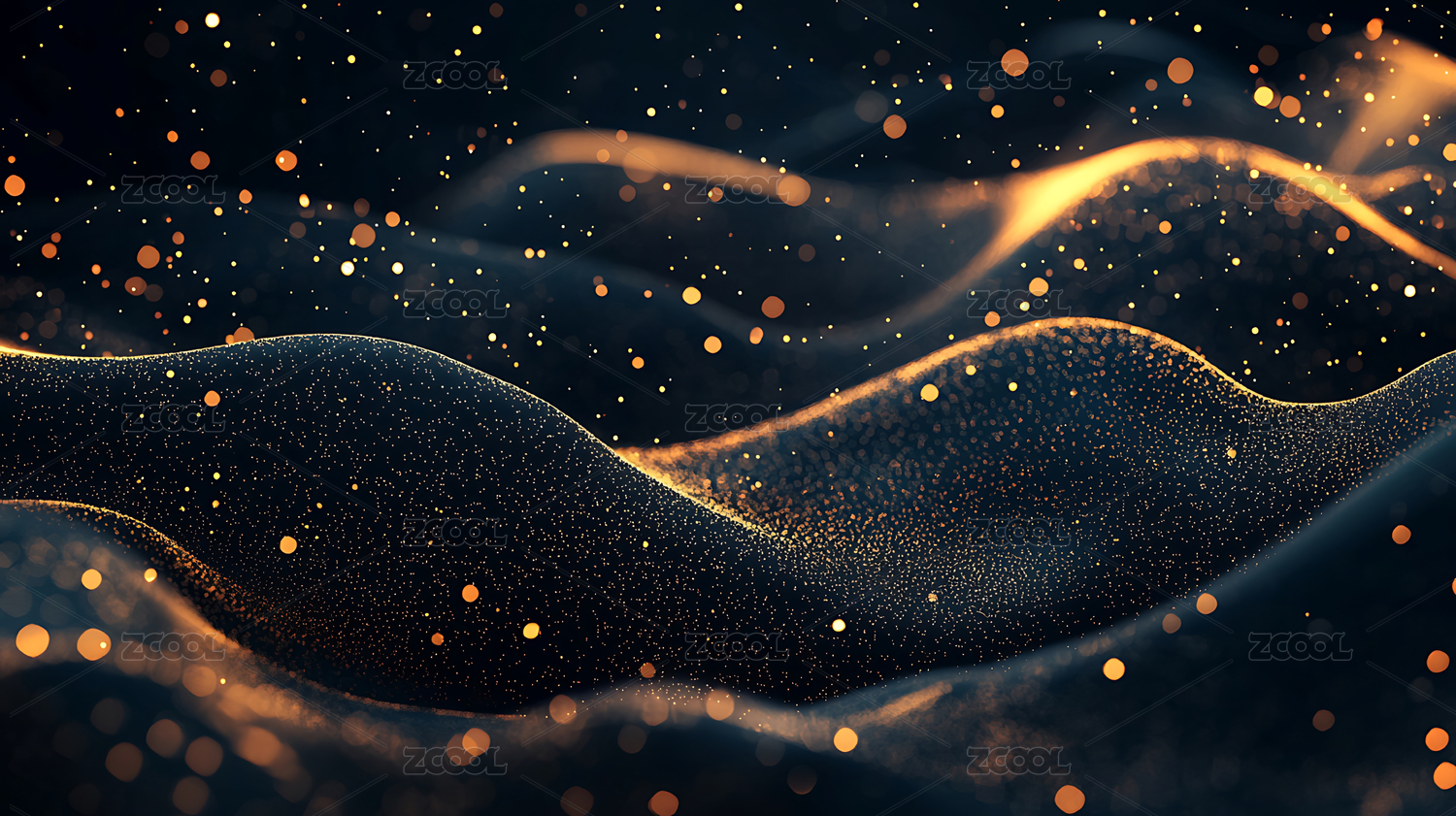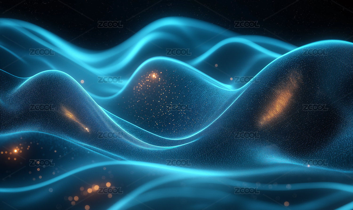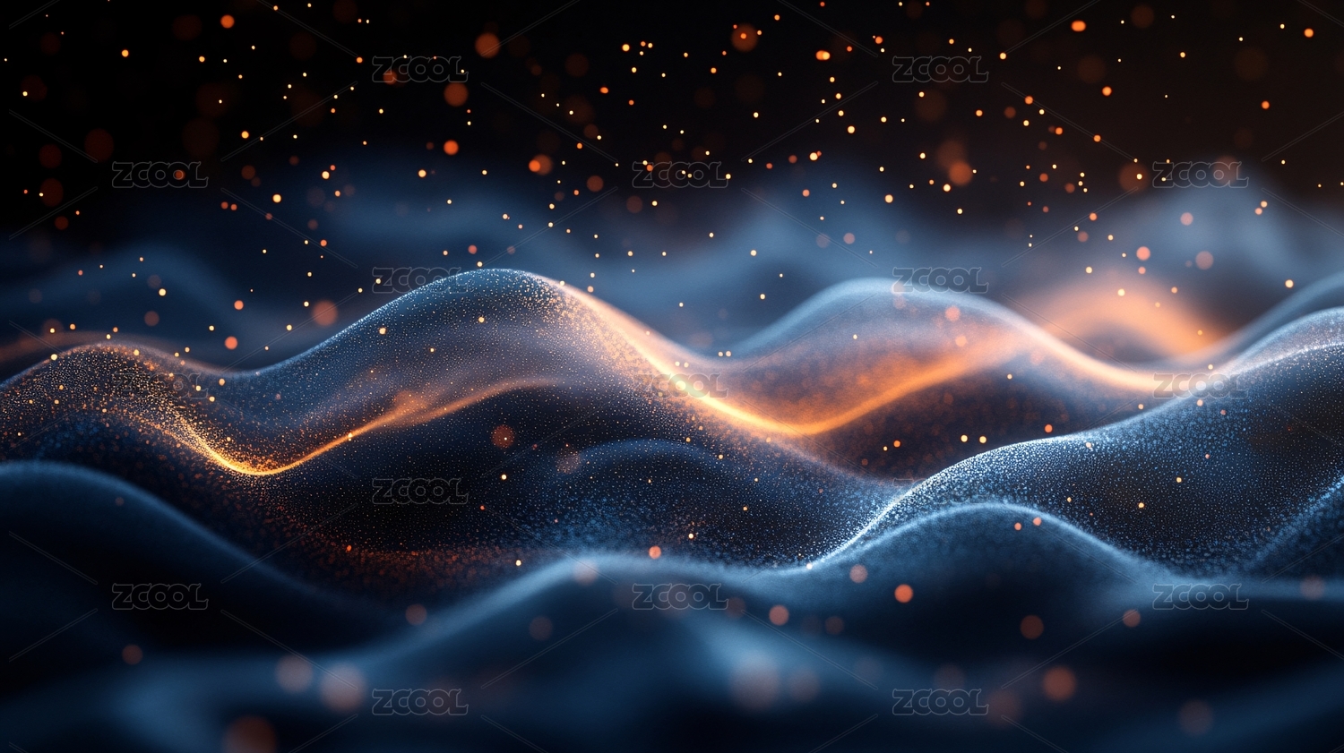 深蓝色波浪抽象海报背景,散发着橙色光点