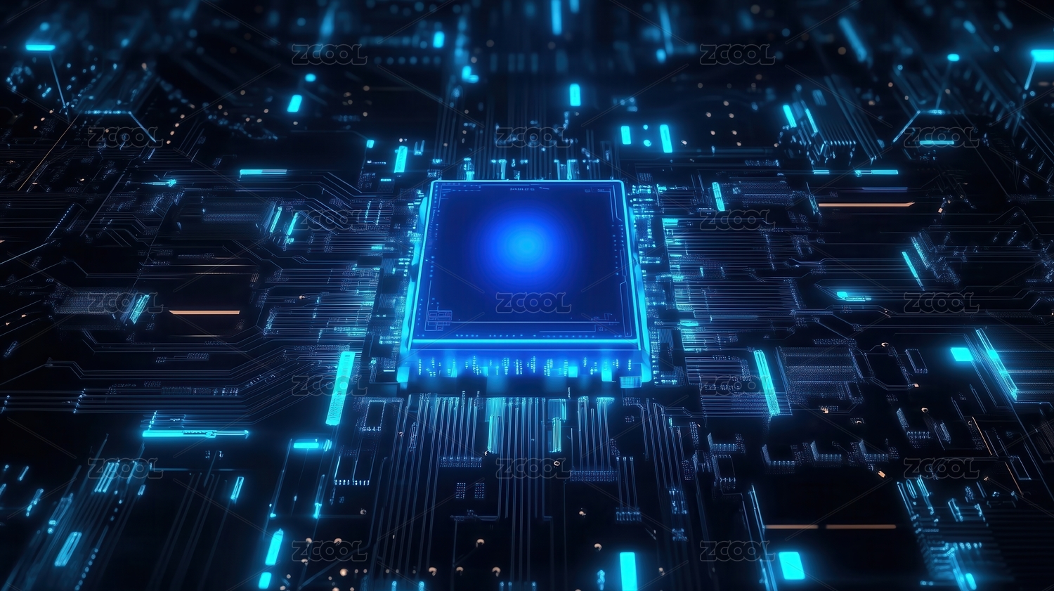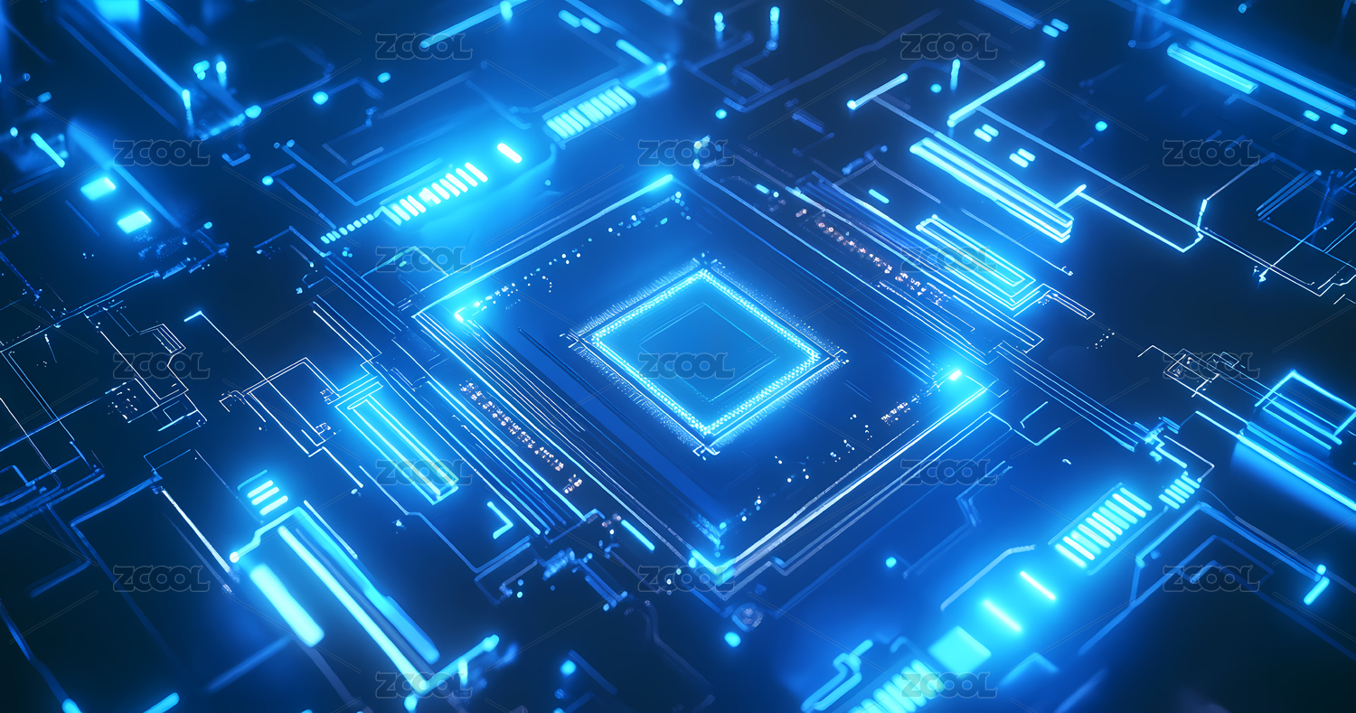 悬浮在深色电路板上方的发光蓝色立方芯片