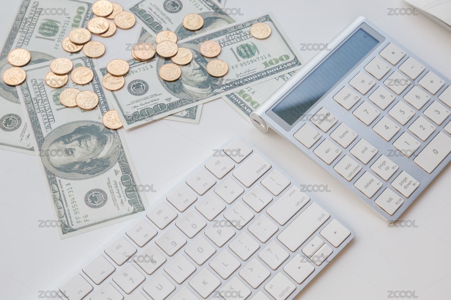 键盘 计算器 硬币 纸币 美元 桌面摆拍