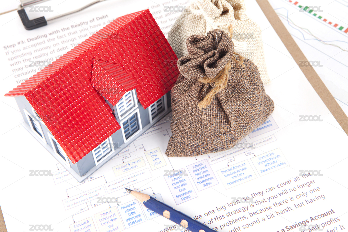 小房子模型和计算器及文件资料和一袋子美元硬币