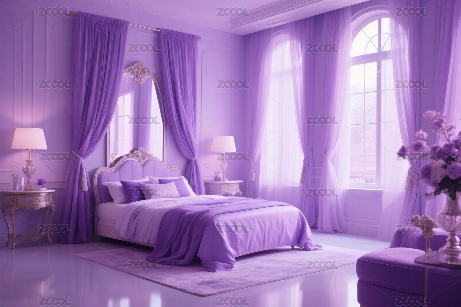 卧室,豪华,紫色,蓝色,黄色,床,窗帘,吊灯,地毯,家具