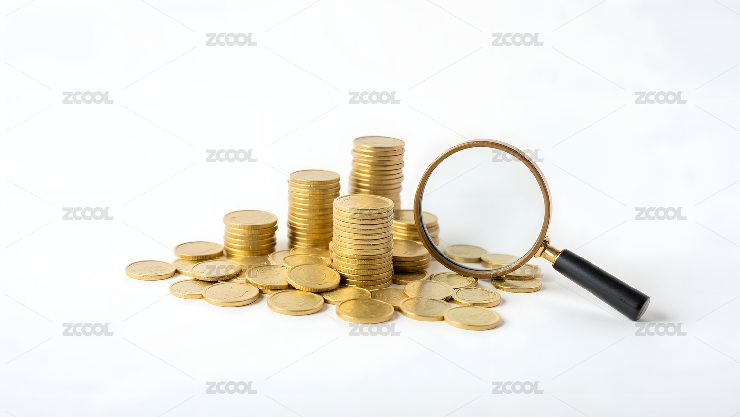白色背景下的放大镜和金币