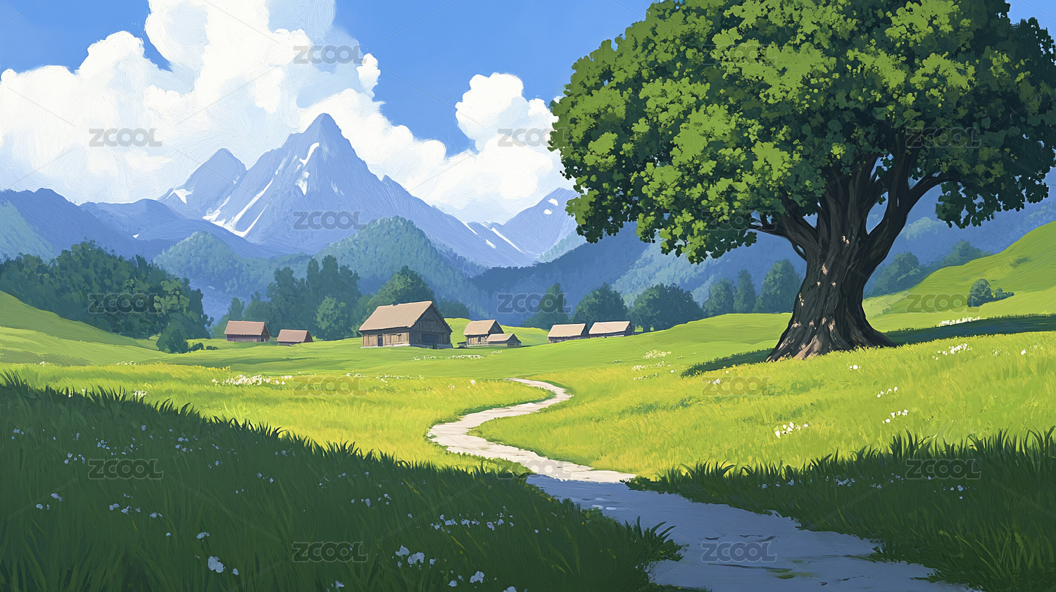 夏天户外旅行山峰房屋乡村风景蓝天白云插画