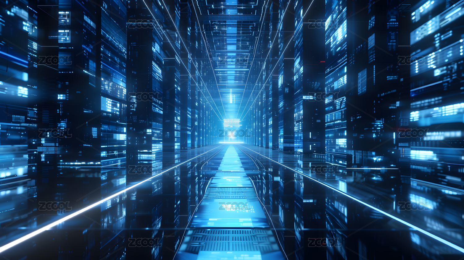 三维渲染的现代化高科技的服务器机房,强大的数据库和运算存储能力。