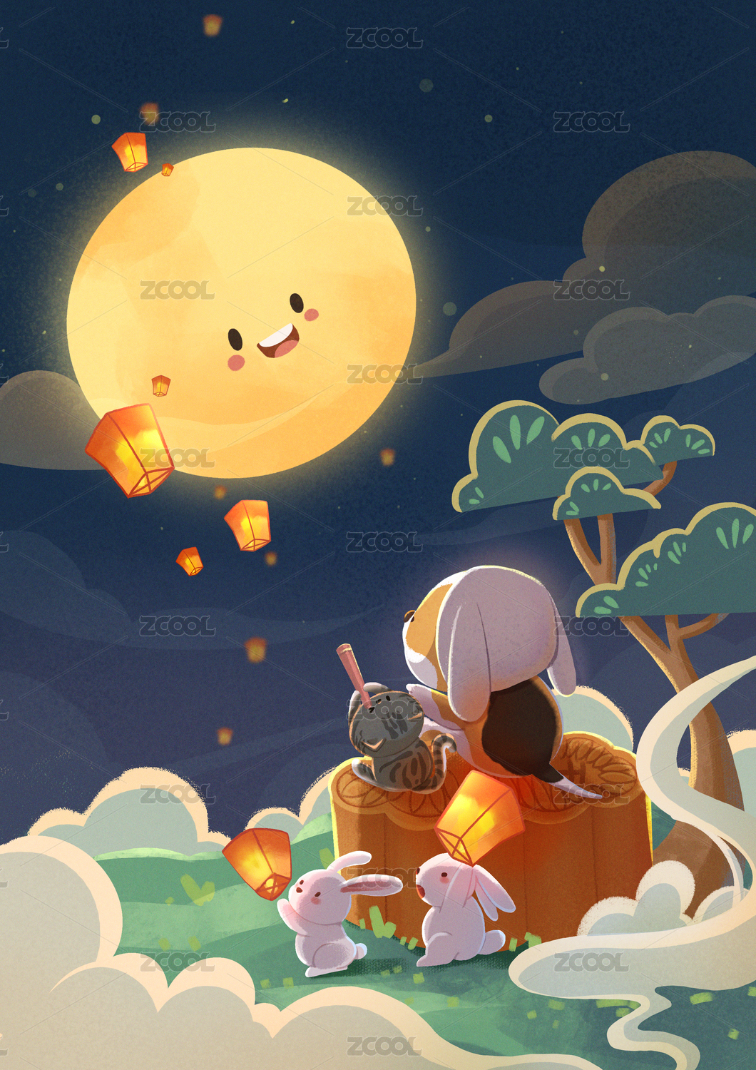 插画,中秋,团圆,赏月,玉兔,孔明灯,天空,仰望,放飞,紫色