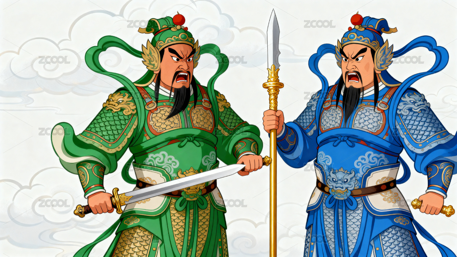 一对门神古装人物横眉冷对手拿兵器刀剑