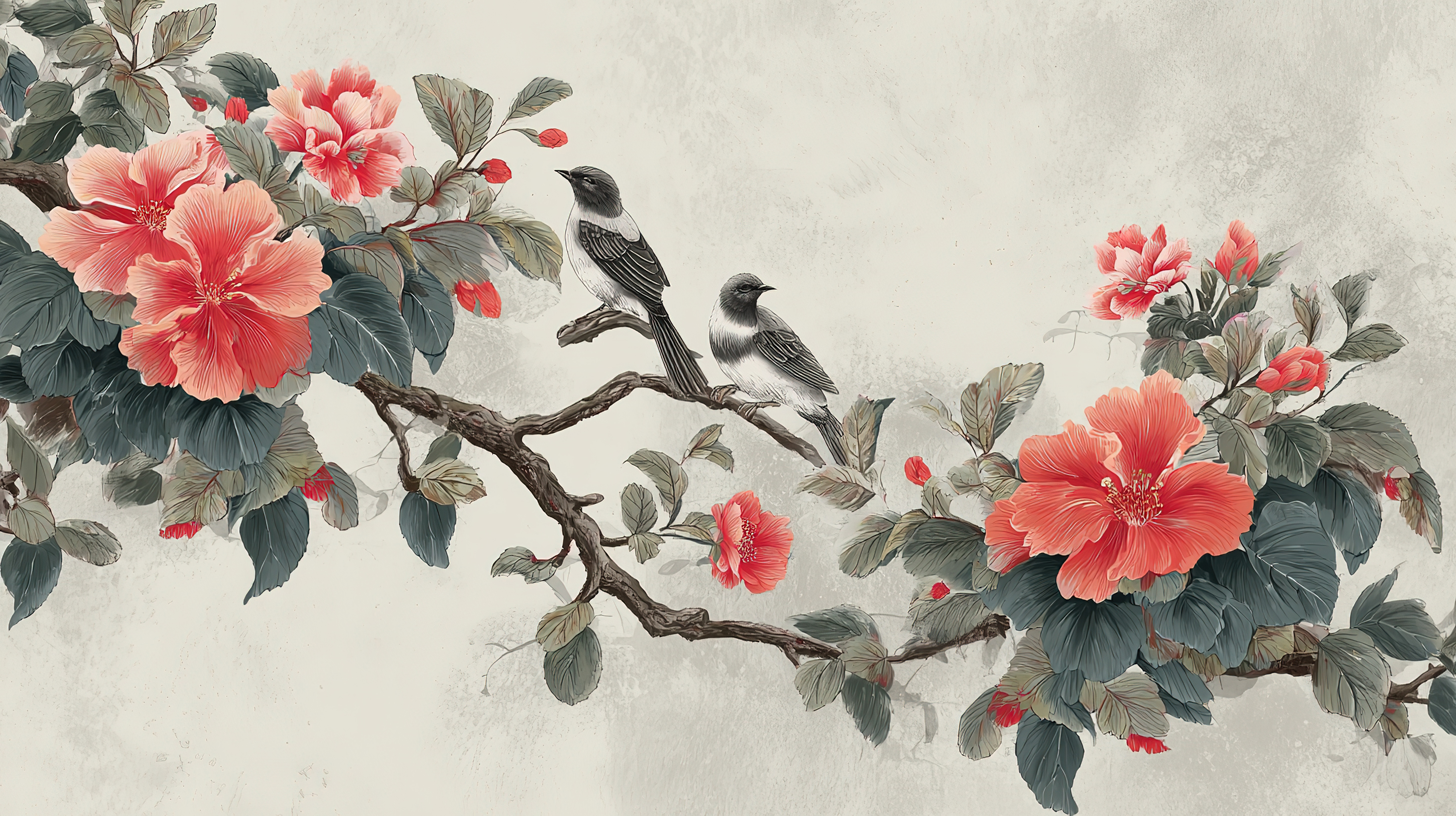 中国风淡彩水墨花鸟植物插画壁纸背景