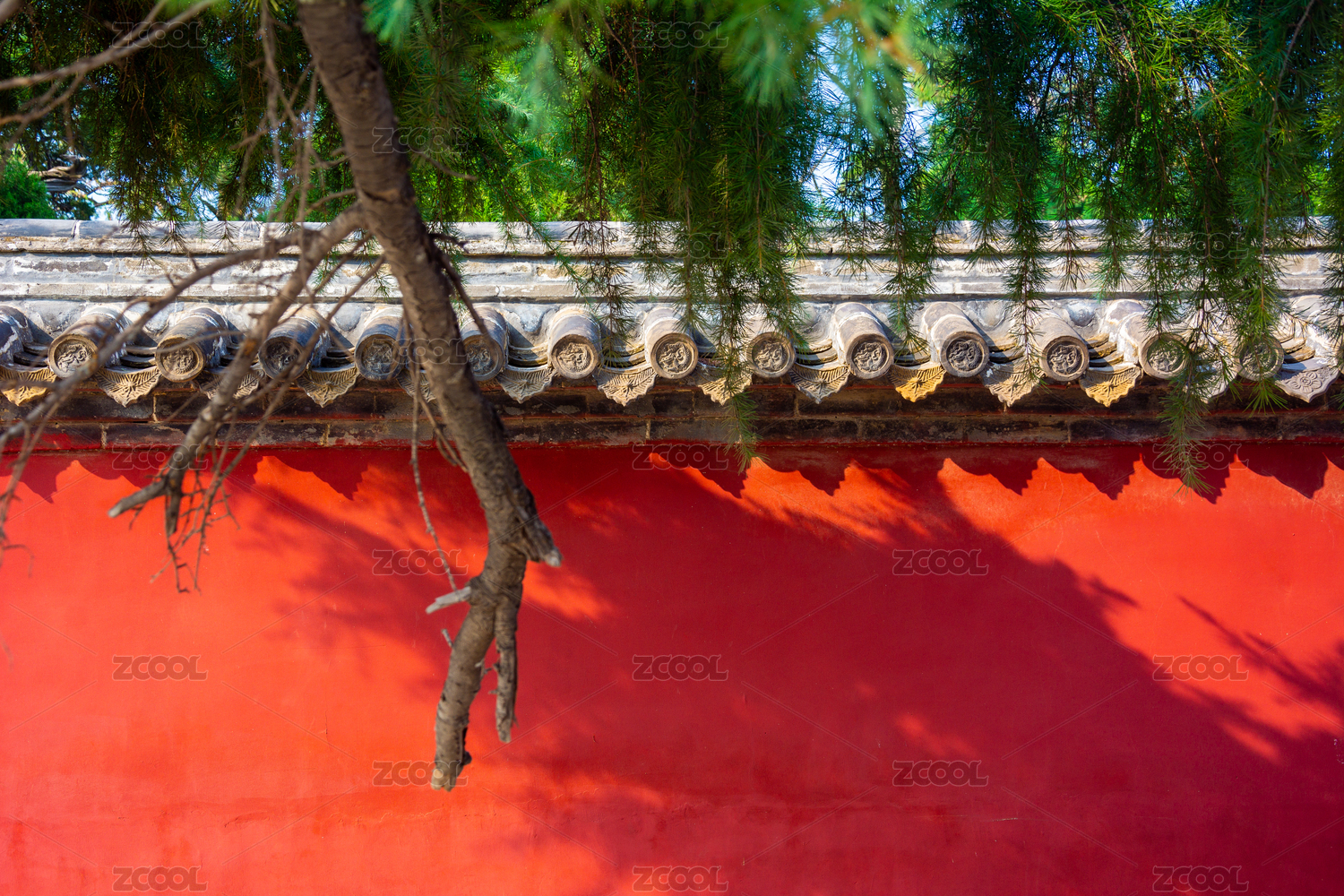 夏日白天的北京故宫红墙与树影