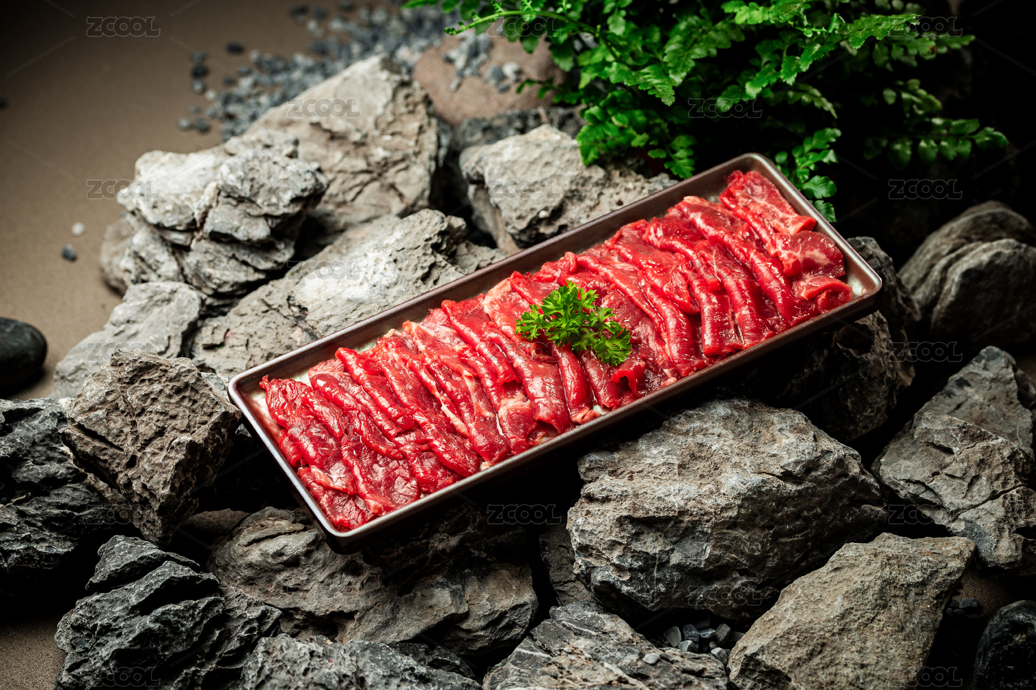 雪花牛肉切片冰上冷冻火锅烧烤食材菜品特写