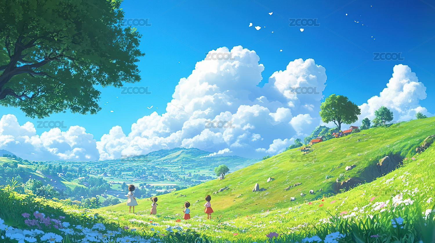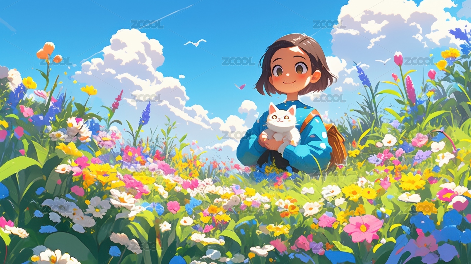 女孩,单独,独自,个人,长裙,黑发,狗,插画,蓝天,白云