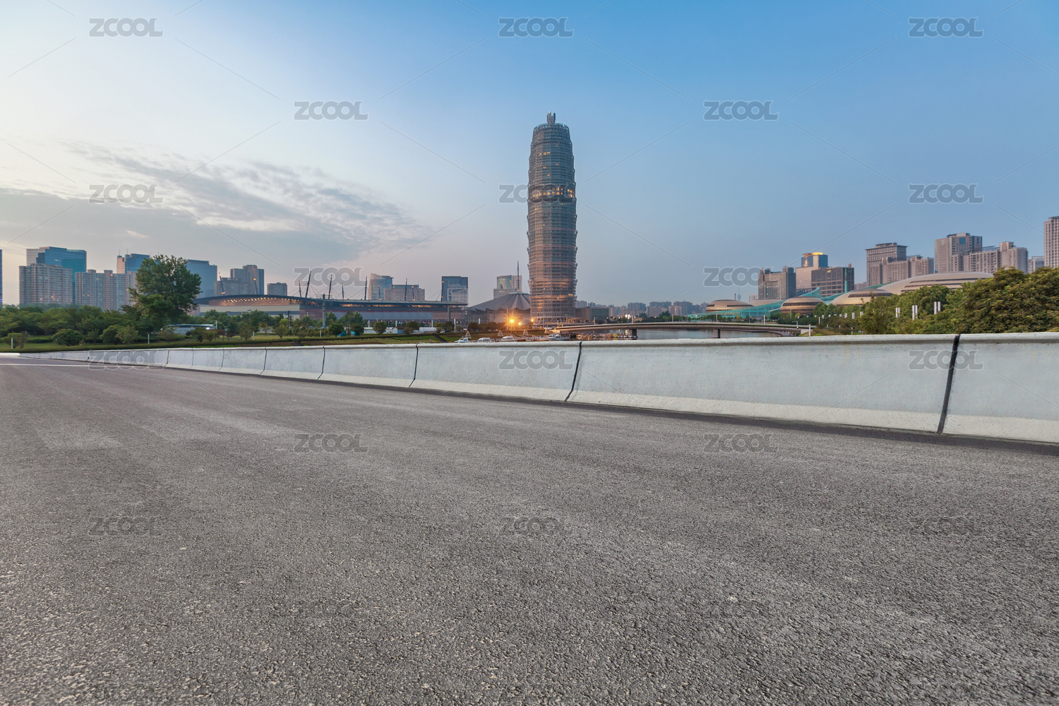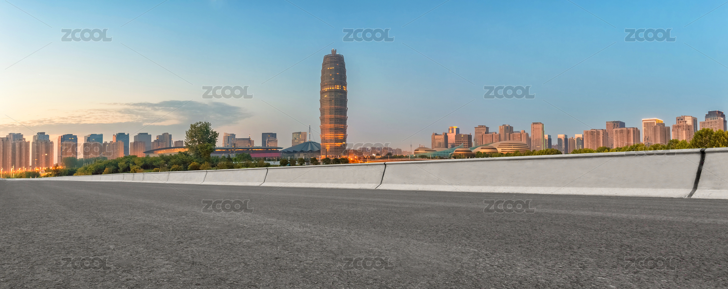黄昏时分,前景为沥青道路的郑州城市景观和城市天际线