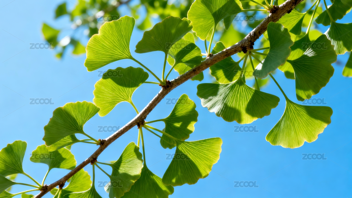 侧逆光条件下一枝金黄色的银杏叶片特写图